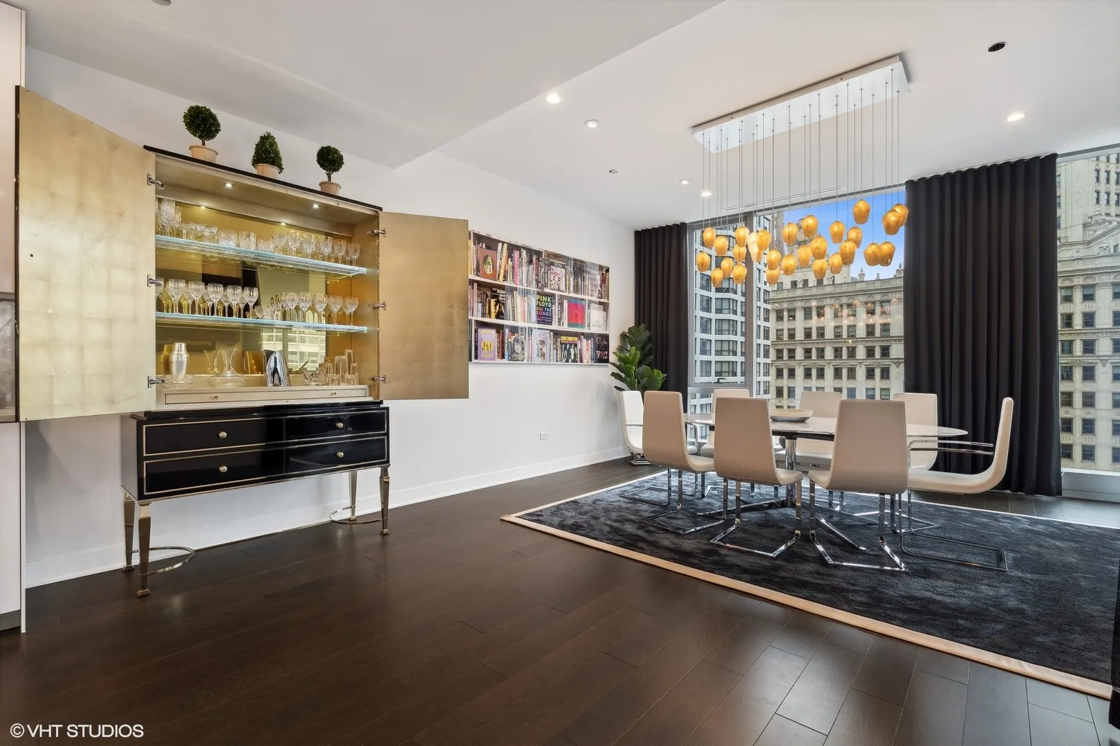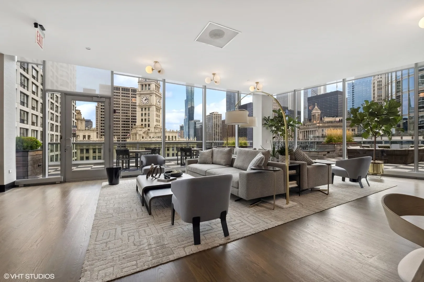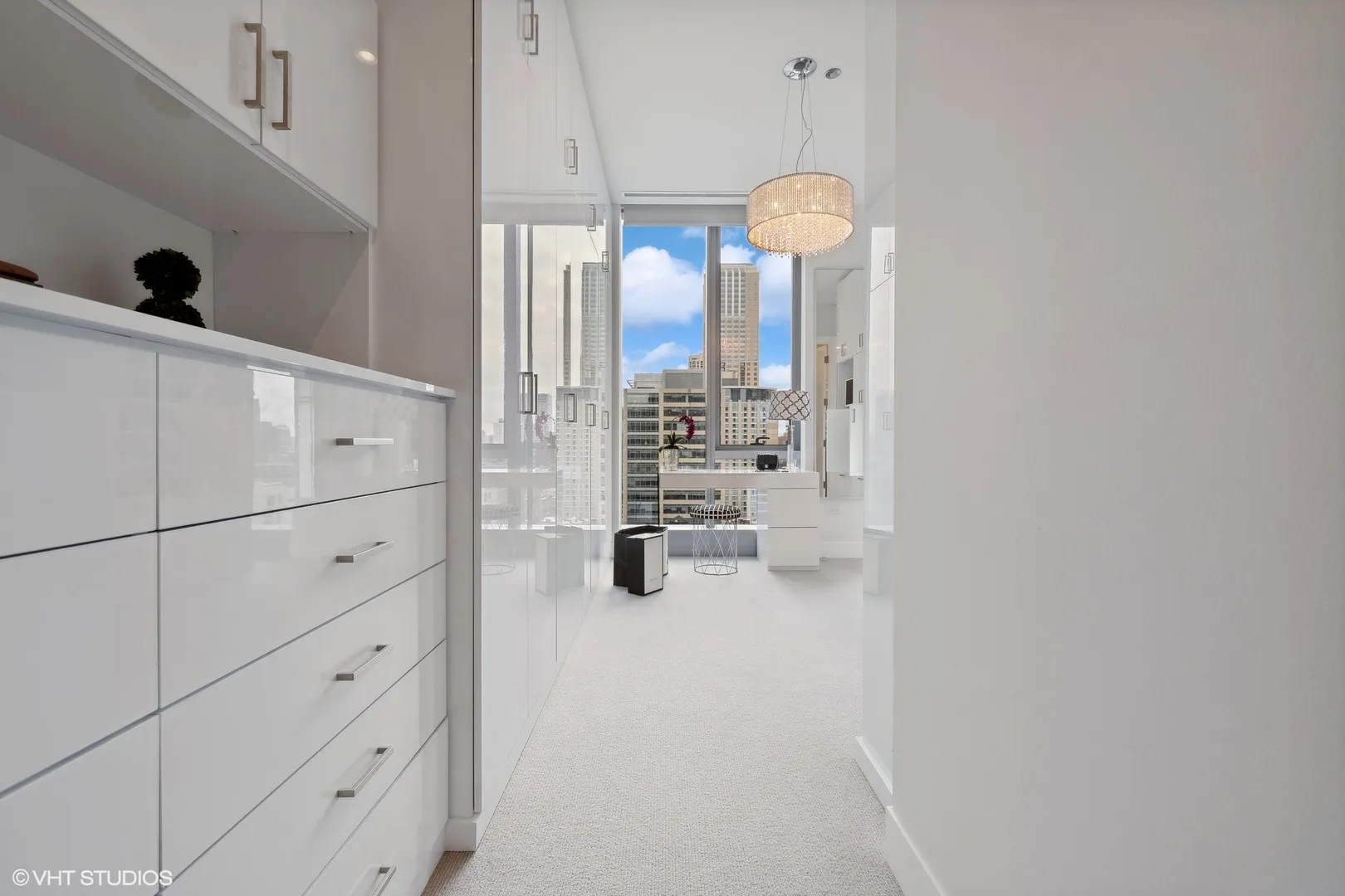This home has a very unique feature: A primary suite with 2 bathrooms and 2 enormous closets. Thoughtfully imagined with impeccable attention to detail, a custom designed dressing room the size of a bedroom is one of two grand closet spaces within the primary suite. The two dream closets/dressing room were professionally designed with plenty of hanging spaces, drawers, and cabinets, all designed to create ease of life with plenty of space. The primary suite also features two elegantly appointed bathrooms; the larger bath features exquisitely designed double vanities, a separate shower, free standing tub, heated floors, and a private water closet – all with spectacular views. The 2nd bath, adjacent to the custom-designed dressing room, has heated marble floors and a tub. Enjoy incredible views of the Chicago River and the city’s most iconic buildings from floor-to-ceiling windows that wrap around this corner home. With over 3,500 square feet of luxurious living and incredible design elements and quality, this is truly the most impressive residence at 403 Wabash. Upon entry, you are greeted with a postcard view revealing the drama of the design and architecture. The open concept living and dining area is perfect for both entertaining and comfortable living. A coveted terrace just off the living room adds allure and allows fresh air while taking in the views. The high-end kitchen can be closed off by an elegant privacy screen- allowing for a more formal experience if needed. Beautifully designed and equipped for serious cooking, the kitchen features fully integrated Wolf and Subzero appliances and a Subzero wine tower and beverage fridge. A rich mix of materials with custom designed Snaidero cabinetry, Dornbracht plumbing fixtures, quartzite stone counters with full backslash, and an expansive center island complete this kitchen. The primary suite is a calming oasis offering a sanctuary for relaxation. The graciously sized bedroom enjoys corner views of the river and city to the south and gorgeous sunsets to the west from floor-to-ceiling windows outfitted with automated window treatments. Thoughtfully imagined with impeccable attention to detail, a custom designed dressing room the size of a bedroom is one of two grand closet spaces within the primary suite. The two dream closets/dressing room were professionally designed with plenty of hanging spaces, drawers, and cabinets, all designed to create ease of life with plenty of space. The primary suite also features two elegantly appointed bathrooms; the larger bath features exquisitely designed double vanities, a separate shower, free standing tub, heated floors, and a private water closet – all with spectacular views. The 2nd bath, adjacent to the custom-designed dressing room, has heated marble floors and a tub. Two additional ensuite bedrooms offer organized closet spaces and heated floors. Closet space is abundant throughout the residence and there is a spacious laundry room, powder room, and extra storage. Other highlights include an exceptional Sonos system throughout the residence and electric blinds. This pet friendly building offers an array of amenities that cater to your every need. Enjoy the crisp breeze and the warmth of a fireplace on the top of the buildings outdoor terrace, gather with friends in the private screening room, challenge your friends to a game in the game room, or host unforgettable gatherings in the indoor and outdoor kitchens. Maintain your inner peace in the tranquil yoga room and stay in shape in the fitness center. Two indoor garage parking spots available