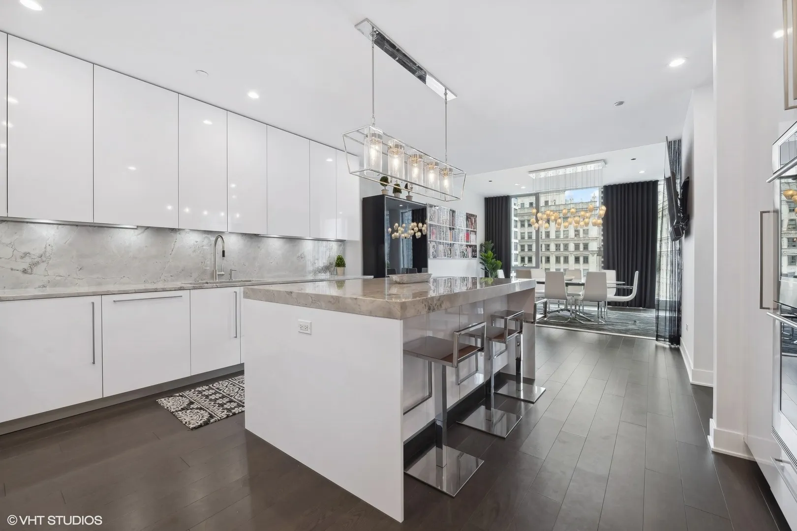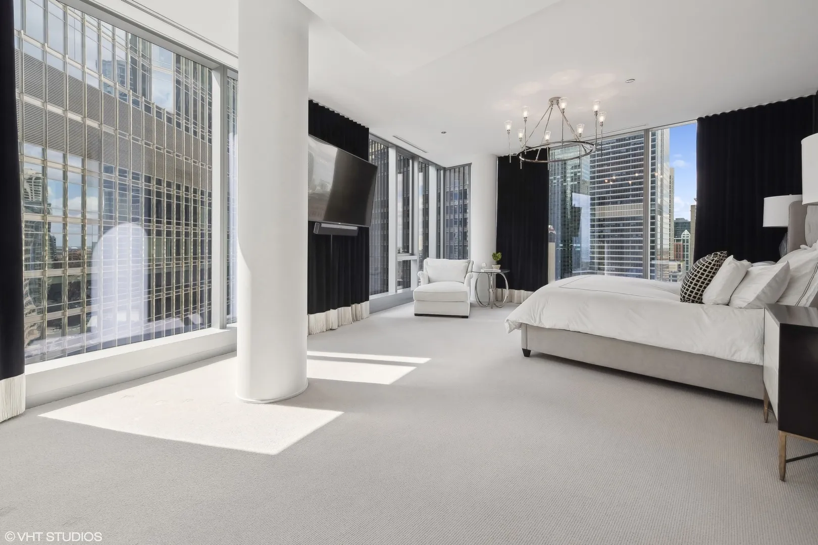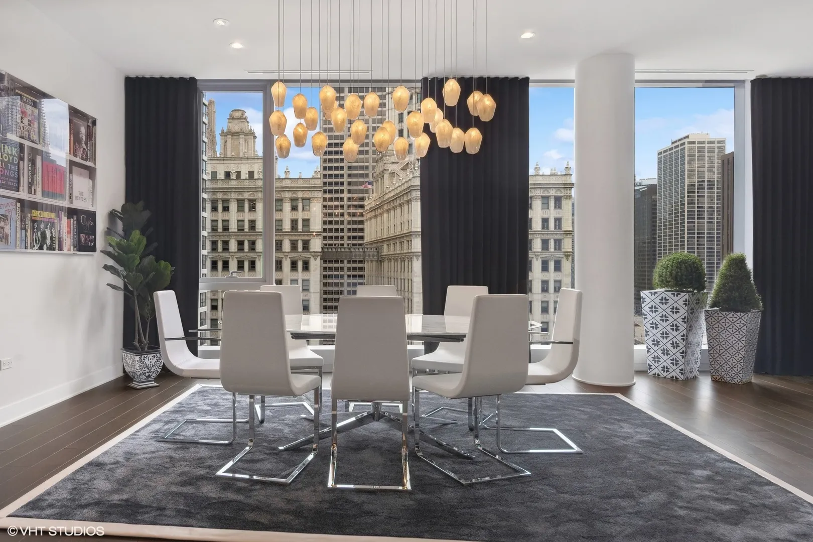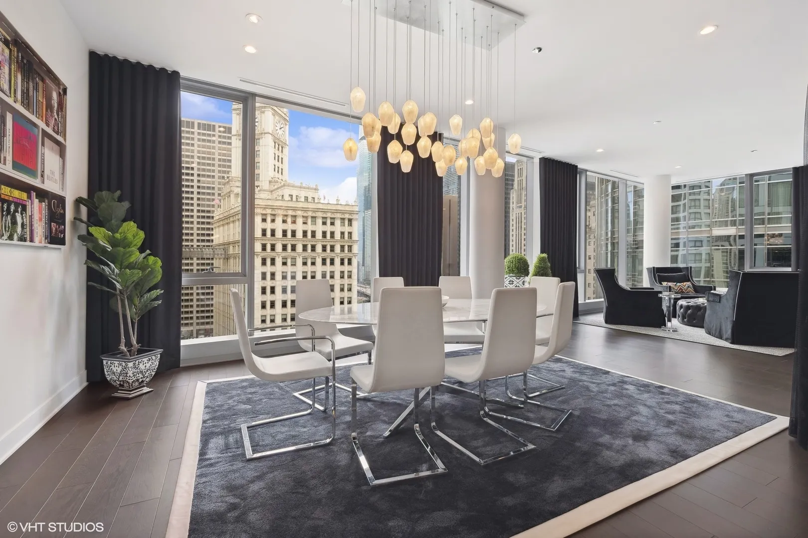 This home has a very unique feature: A primary suite with 2 bathrooms and 2 enormous closets. Thoughtfully imagined with impeccable attention to detail, a custom designed dressing room the size of a bedroom is one of two grand closet spaces within the primary suite. The two dream closets/dressing room were professionally designed with plenty of hanging spaces, drawers, and cabinets, all designed to create ease of life with plenty of space. The primary suite also features two elegantly appointed bathrooms; the larger bath features exquisitely designed double vanities, a separate shower, free standing tub, heated floors, and a private water closet – all with spectacular views. The 2nd bath, adjacent to the custom-designed dressing room, has heated marble floors and a tub. Enjoy incredible views of the Chicago River and the city’s most iconic buildings from floor-to-ceiling windows that wrap around this corner home. With over 3,500 square feet of luxurious living and incredible design elements and quality, this is truly the most impressive residence at 403 Wabash. Upon entry, you are greeted with a postcard view revealing the drama of the design and architecture. The open concept living and dining area is perfect for both entertaining and comfortable living. A coveted terrace just off the living room adds allure and allows fresh air while taking in the views. The high-end kitchen can be closed off by an elegant privacy screen- allowing for a more formal experience if needed. Beautifully designed and equipped for serious cooking, the kitchen features fully integrated Wolf and Subzero appliances and a Subzero wine tower and beverage fridge. A rich mix of materials with custom designed Snaidero cabinetry, Dornbracht plumbing fixtures, quartzite stone counters with full backslash, and an expansive center island complete this kitchen. The primary suite is a calming oasis offering a sanctuary for relaxation. The graciously sized bedroom enjoys corner views of the river and city to the south and gorgeous sunsets to the west from floor-to-ceiling windows outfitted with automated window treatments. Thoughtfully imagined with impeccable attention to detail, a custom designed dressing room the size of a bedroom is one of two grand closet spaces within the primary suite. The two dream closets/dressing room were professionally designed with plenty of hanging spaces, drawers, and cabinets, all designed to create ease of life with plenty of space. The primary suite also features two elegantly appointed bathrooms; the larger bath features exquisitely designed double vanities, a separate shower, free standing tub, heated floors, and a private water closet – all with spectacular views. The 2nd bath, adjacent to the custom-designed dressing room, has heated marble floors and a tub. Two additional ensuite bedrooms offer organized closet spaces and heated floors. Closet space is abundant throughout the residence and there is a spacious laundry room, powder room, and extra storage. Other highlights include an exceptional Sonos system throughout the residence and electric blinds. This pet friendly building offers an array of amenities that cater to your every need. Enjoy the crisp breeze and the warmth of a fireplace on the top of the buildings outdoor terrace, gather with friends in the private screening room, challenge your friends to a game in the game room, or host unforgettable gatherings in the indoor and outdoor kitchens. Maintain your inner peace in the tranquil yoga room and stay in shape in the fitness center. Two indoor garage parking spots available