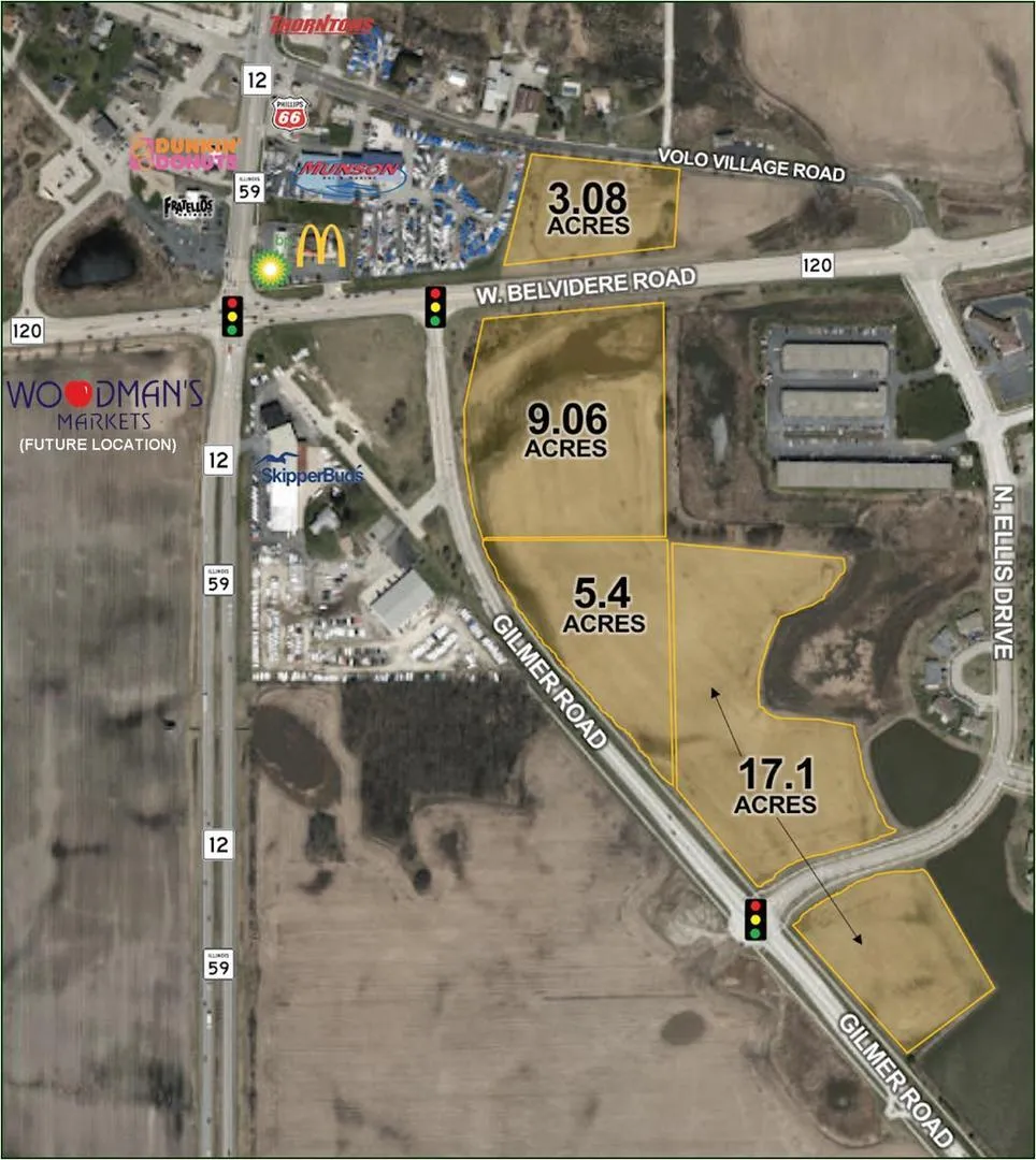 Prime development opportunity at SEC of Route 120 and Gilmer Road. 4 parcels with excellent frontage and visibility, 3-34.7 acres. Several proposed new retail, mixed use developments nearby including Woodman’s as SWC of Route 120 & Route 12. Signalized corner. Contact Listing Brokers.