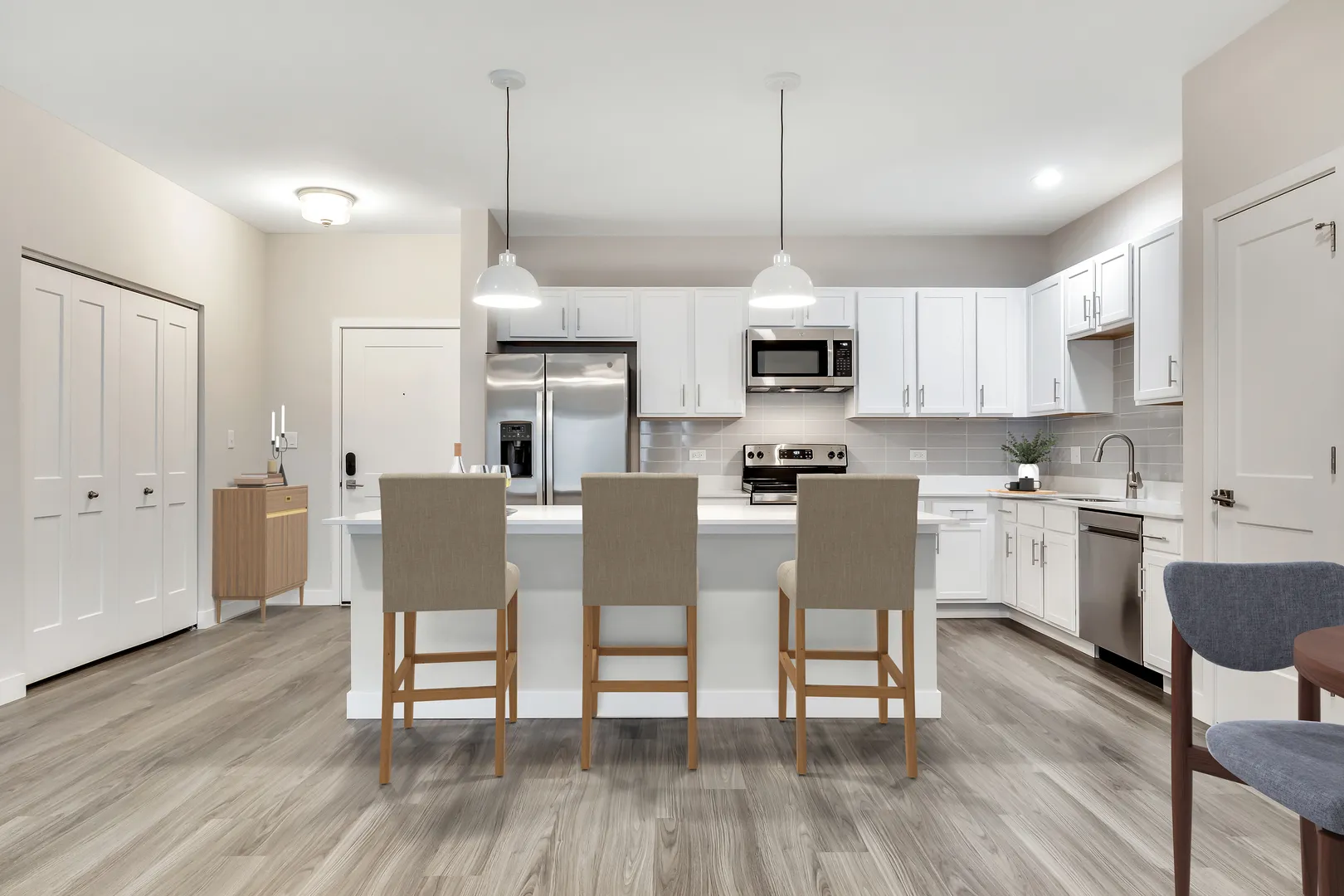 Stunning new construction property with outstanding amenities, including a 6,000 sf clubhouse and pool, adjacent to 40,000 acres of forest preserves. These sleek, CORNER UNIT apartments live single family with 9ft Ceilings, Open Concept plans, Wood laminate floors throughout, High end luxury finishes and optional indoor garage. Amenities include: Custom White Kitchens with Quartz Counters and Center Island, Glass Backsplash, Stainless kitchen appliances including:Side by Side Refrigerator with ice-maker, Ceramic-Top Ranges, Microwave, Dishwasher, Deep Undermount Sink, Gooseneck Pull-down Faucet, Polished Chrome Hardware, Large Baths with White tile, Walk-in Shower, Framed Mirrors, Linen Closet, Washer Dryer Included. Clubhouse with Fireplace, Resident Hideaway w/ Billiards, Internet Cafe & WiFi In Amenity Areas, 24/7 Package Lockers, Resort Inspired POOL, w/shaded Soft Seating, Pet Friendly w/ Shaded Dog Run & Grooming Station, Outdoor Kitchen w/ Gourmet Gas Grills, Fitness GYM w/ Virtual Spin Room, Health Club, Quality Precor & Expresso Equipment, Yoga Studio + Resistance & Free Weights. Electric Vehicle Charging Stations. Metra Train to City blocks nearby! Everything you need and more, with no Security Deposit! Exterior parking included. Indoor is available. Move in immediately!