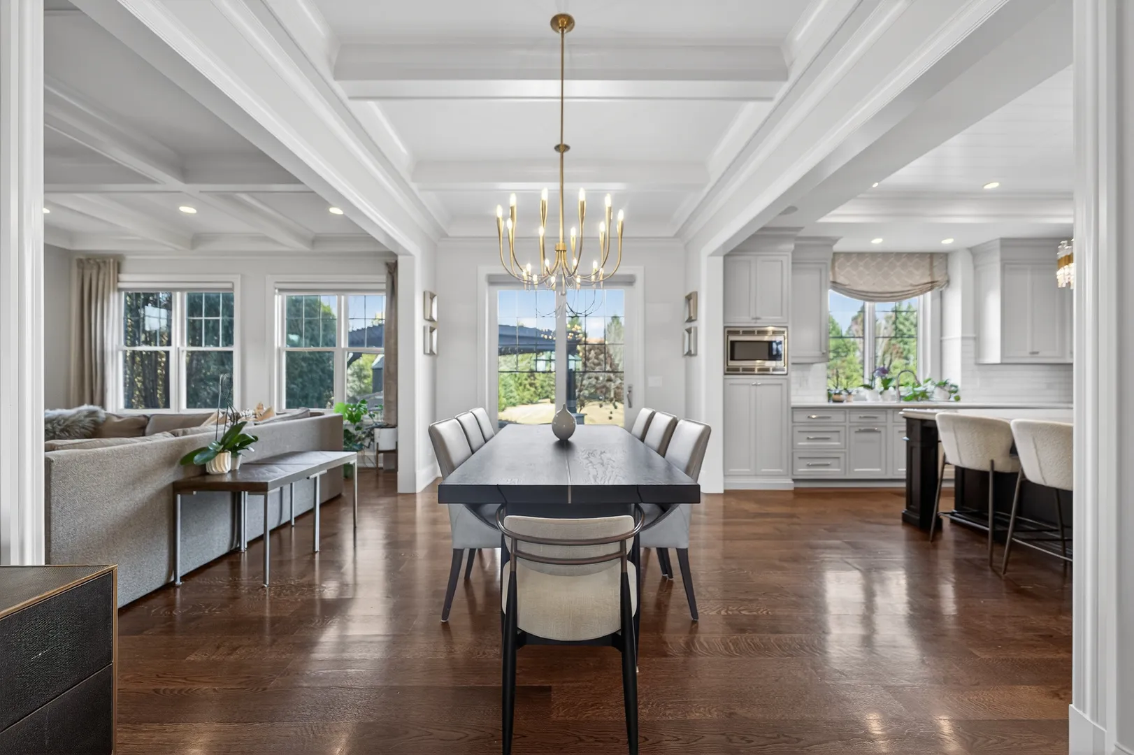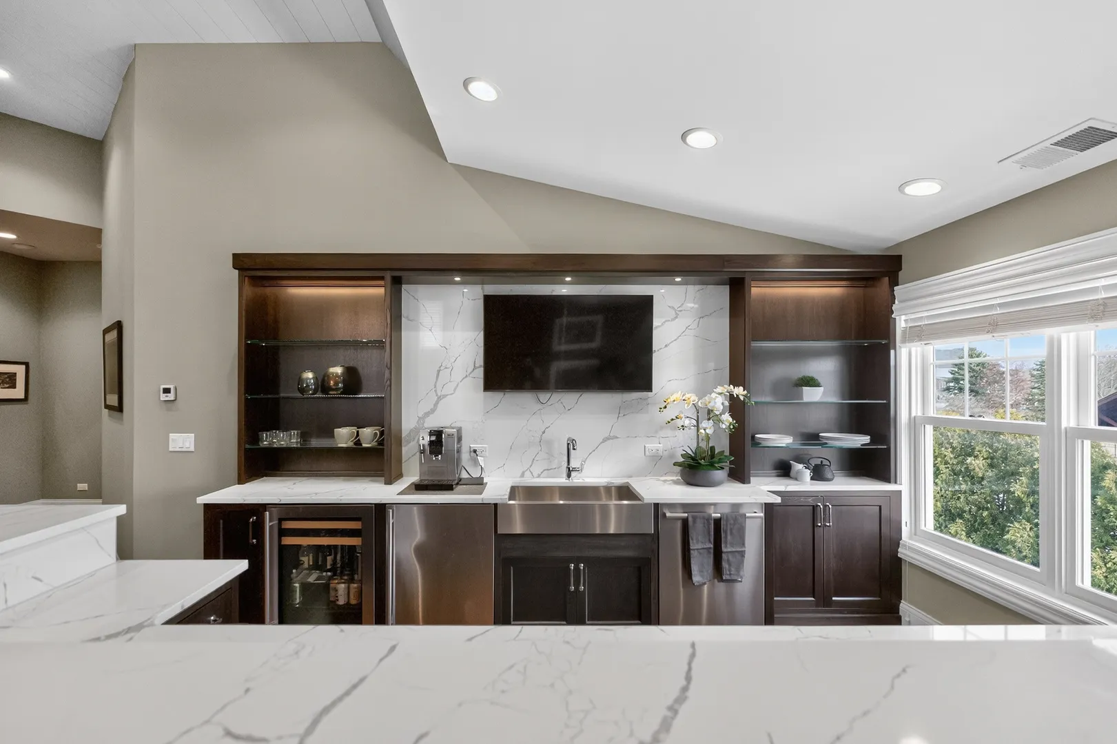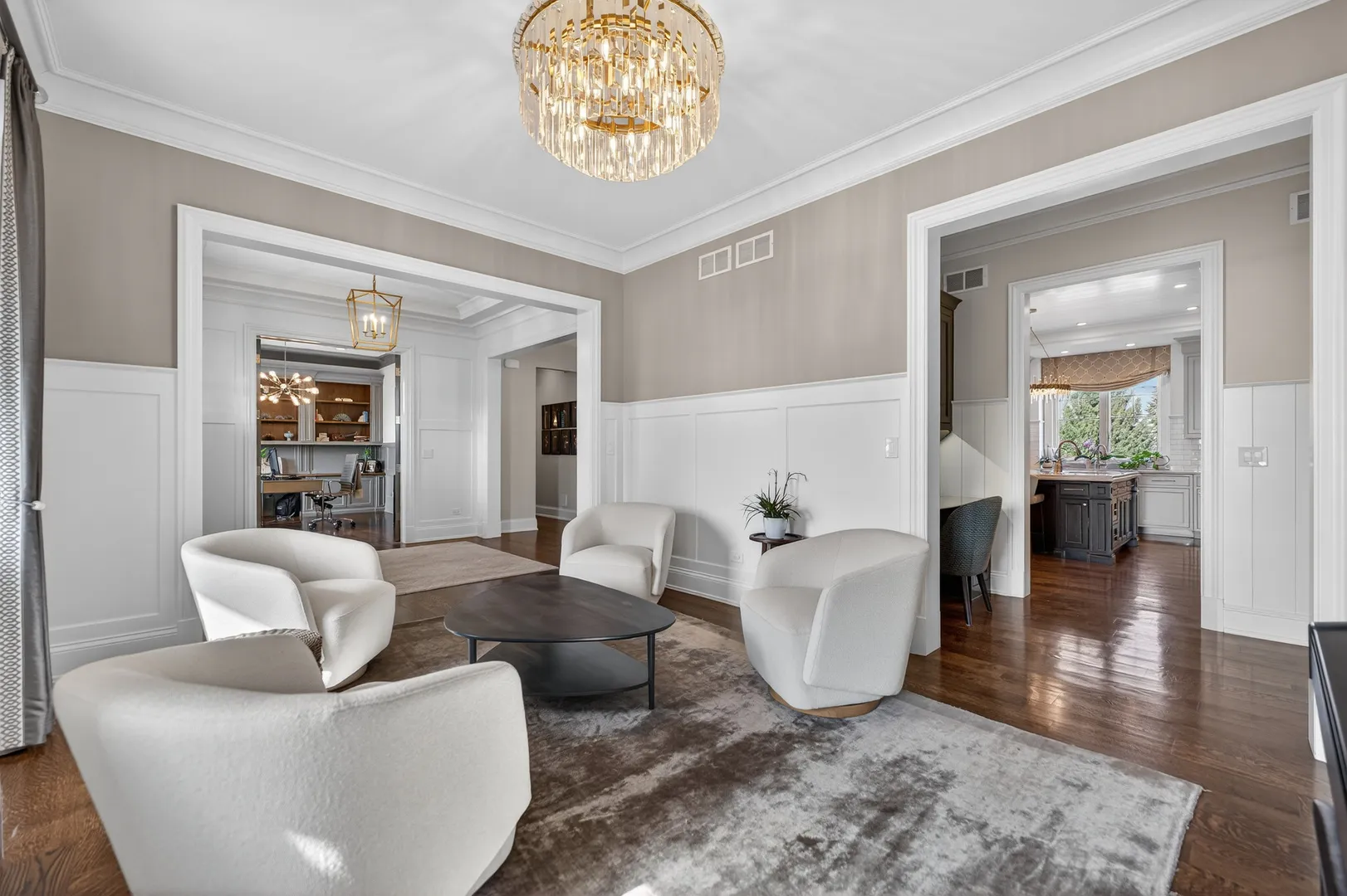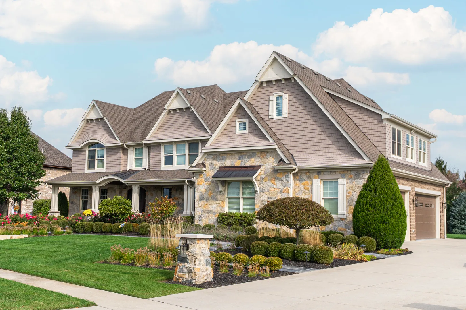 This incredible home offers a thoughtfully designed multi-generational living space, complete with a breakfast bar, family room, private bedroom ideal for a caregiver, full bath, & walk-in closet-perfect for extended family, guests, or independent living within the home. A bluestone paver entrance & expansive front porch create a striking first impression with timeless curb appeal. Inside, refined design unfolds through custom millwork, designer trim, & upscale finishes throughout. The grand foyer sets the tone for elevated living, while a front office framed by French doors & custom built-ins captures serene lake views-ideal for a sophisticated work-from-home setting. The heart of the home is an extraordinary kitchen, designed for both everyday living & elevated entertaining. It features Calacatta Brazil Quartzite countertops, stainless steel appliances, ultra-quality cabinetry, a striking shiplap tray ceiling, & a generous breakfast-bar island. The kitchen opens seamlessly to the expansive family room, where a coffered ceiling, elegant fireplace, & custom trim create a warm yet sophisticated gathering space. Just beyond, the formal living room showcases detailed wainscoting, crown molding, & oversized windows that flood the space with natural light. A spacious dining area & butler’s pantry further enhance functionality & style. Rare main-level features include two half baths, a custom mudroom with built-ins, & a versatile washing station ideal for pets or utility use. The primary suite offers a true retreat with beamed cathedral ceilings, hardwood floors, dual custom walk-in closets, & a spa-inspired bath designed for relaxation. Additional bedrooms feature intricate ceiling details, hardwood flooring, & bright oversized windows, while secondary baths include heated flooring. The fully finished lower level adds another layer of luxury with a sleek wet bar, full bath, expansive great room, bonus room, & a fifth bedroom or fitness space. Outdoors, the covered patio with pergola & fireplace overlooks a private, landscaped backyard surrounded by mature trees-offering a serene setting for entertaining or quiet enjoyment. Additional highlights include a Sonos wireless sound system, invisible fencing, full irrigation system, & an oversized radiant-heated four-car garage with nine-foot doors, epoxy flooring, utility sink, & EV charging capability. The home is fully smart-home equipped with app-controlled climate, Lutron lighting, & an extensive security system. Located within a highly rated school district & minutes from dining, shopping, golf, & everyday conveniences, this residence delivers exceptional flexibility, refined design, & luxury living at every level.