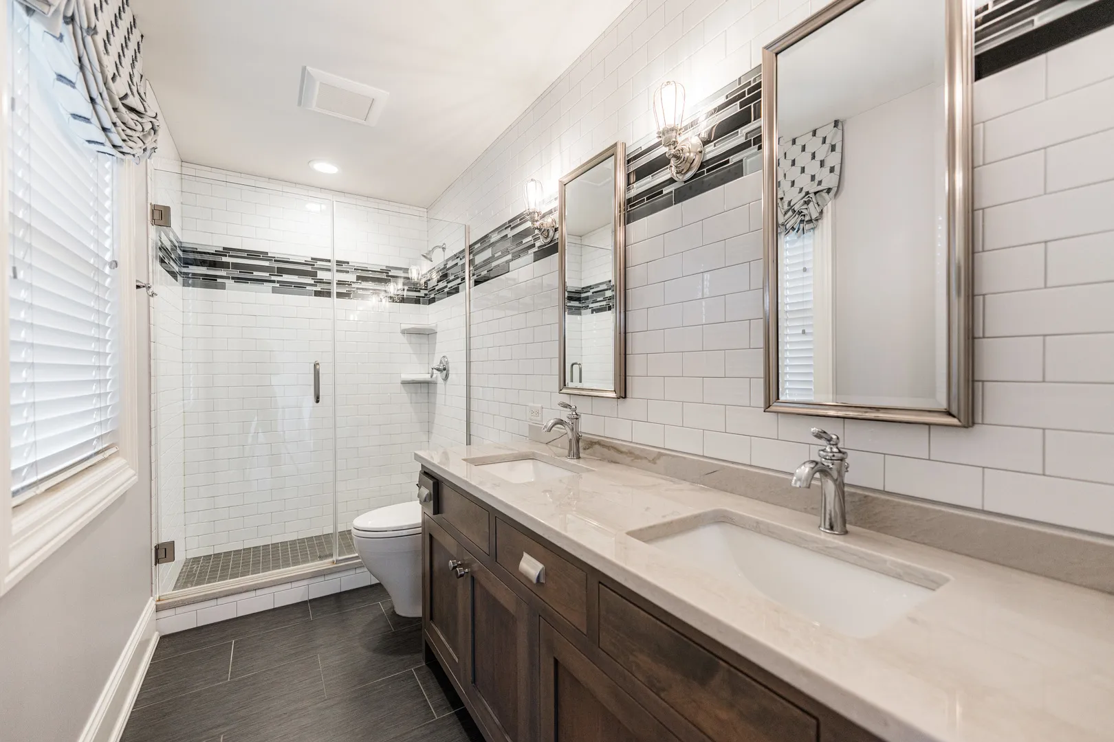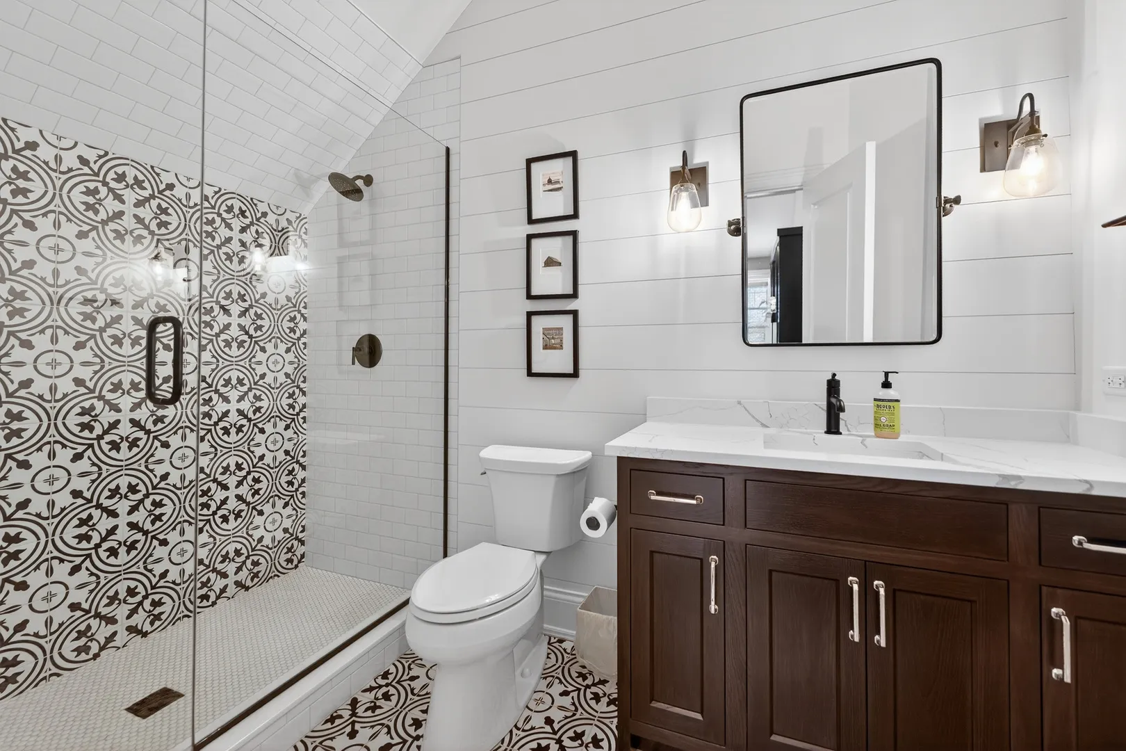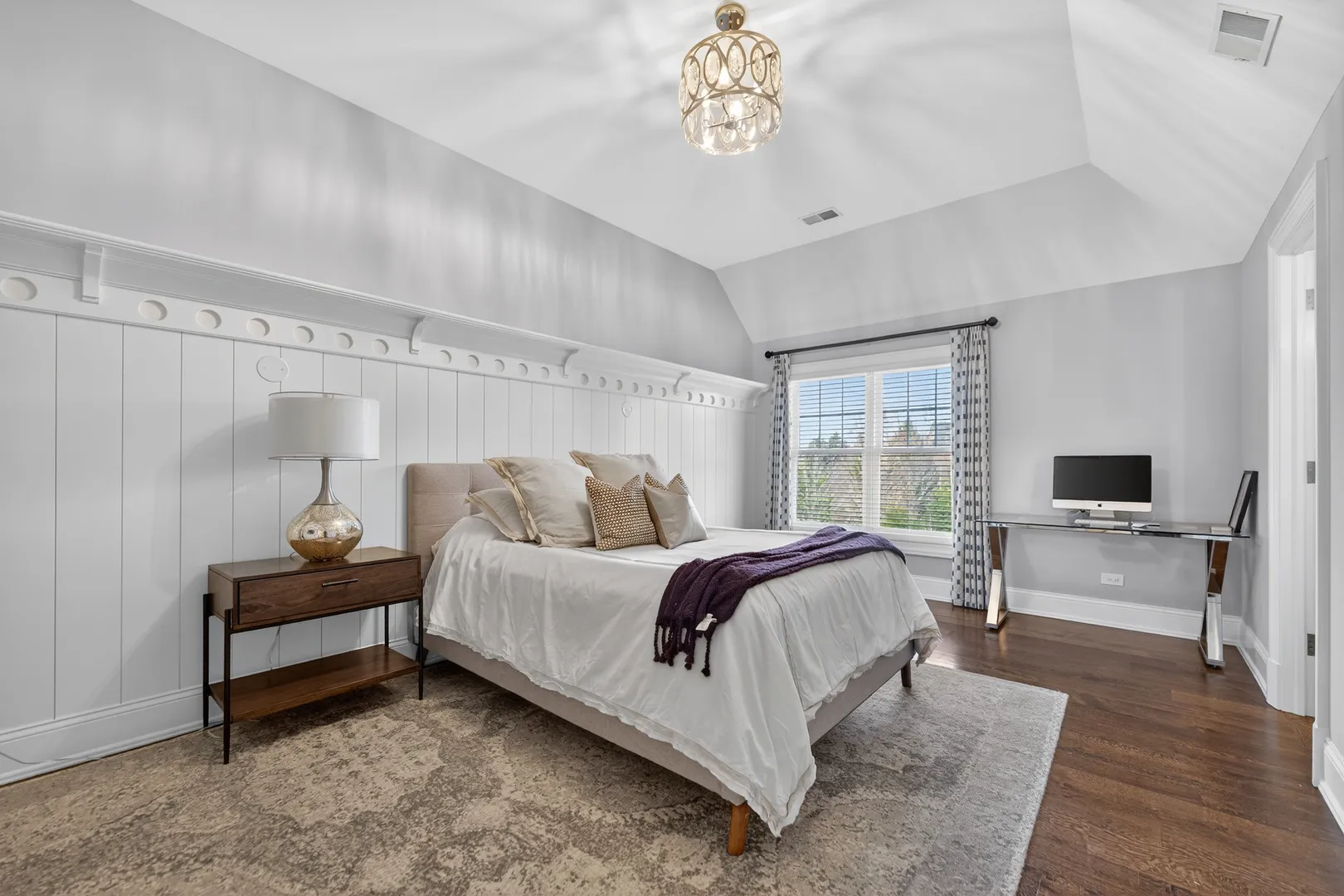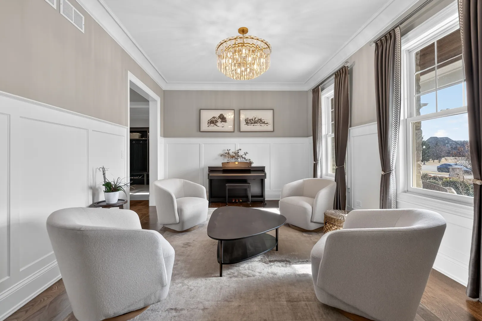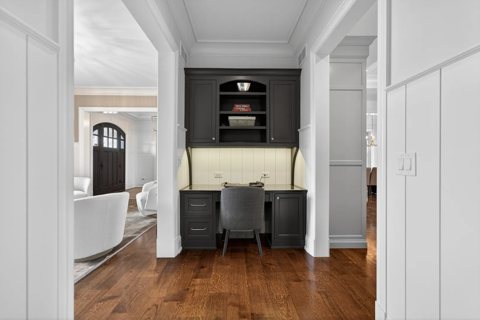 This incredible home offers a thoughtfully designed multi-generational living space, complete with a breakfast bar, family room, private bedroom ideal for a caregiver, full bath, & walk-in closet-perfect for extended family, guests, or independent living within the home. A bluestone paver entrance & expansive front porch create a striking first impression with timeless curb appeal. Inside, refined design unfolds through custom millwork, designer trim, & upscale finishes throughout. The grand foyer sets the tone for elevated living, while a front office framed by French doors & custom built-ins captures serene lake views-ideal for a sophisticated work-from-home setting. The heart of the home is an extraordinary kitchen, designed for both everyday living & elevated entertaining. It features Calacatta Brazil Quartzite countertops, stainless steel appliances, ultra-quality cabinetry, a striking shiplap tray ceiling, & a generous breakfast-bar island. The kitchen opens seamlessly to the expansive family room, where a coffered ceiling, elegant fireplace, & custom trim create a warm yet sophisticated gathering space. Just beyond, the formal living room showcases detailed wainscoting, crown molding, & oversized windows that flood the space with natural light. A spacious dining area & butler’s pantry further enhance functionality & style. Rare main-level features include two half baths, a custom mudroom with built-ins, & a versatile washing station ideal for pets or utility use. The primary suite offers a true retreat with beamed cathedral ceilings, hardwood floors, dual custom walk-in closets, & a spa-inspired bath designed for relaxation. Additional bedrooms feature intricate ceiling details, hardwood flooring, & bright oversized windows, while secondary baths include heated flooring. The fully finished lower level adds another layer of luxury with a sleek wet bar, full bath, expansive great room, bonus room, & a fifth bedroom or fitness space. Outdoors, the covered patio with pergola & fireplace overlooks a private, landscaped backyard surrounded by mature trees-offering a serene setting for entertaining or quiet enjoyment. Additional highlights include a Sonos wireless sound system, invisible fencing, full irrigation system, & an oversized radiant-heated four-car garage with nine-foot doors, epoxy flooring, utility sink, & EV charging capability. The home is fully smart-home equipped with app-controlled climate, Lutron lighting, & an extensive security system. Located within a highly rated school district & minutes from dining, shopping, golf, & everyday conveniences, this residence delivers exceptional flexibility, refined design, & luxury living at every level.
