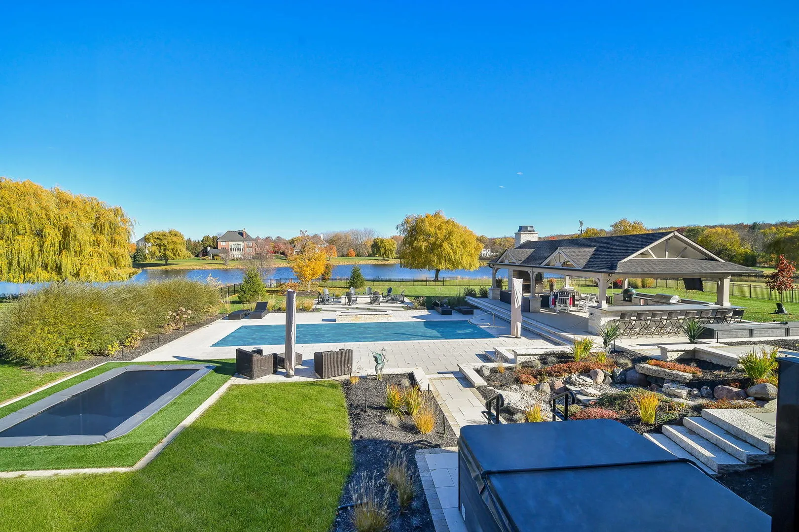 Resort Living in Prairie Lakes! Experience luxury resort living every day in this stunning custom-built home in Prairie Lakes! The showstopping backyard oasis invites relaxation and entertainment with a striking deep-blue sapphire color inground pool featuring a waterfall, bubblers, sun deck, deck jets, and automatic cover. Enjoy multiple fire pits, a fully equipped outdoor kitchen, a pond less pond with cascading waterfall, and a stone fireplace-all overlooking the peaceful lake. A $25,000 outdoor multi-zoned sound system, easily controlled by your cell phone, ensures the perfect atmosphere. The maintenance-free deck located near the kitchen, includes a motorized awning with built-in lighting, creating the perfect spot for outdoor dining and sunset views. The fully fenced yard offers privacy, lush landscaping, and even an inground trampoline for year-round fun. A convenient poolside bathroom makes entertaining effortless. Inside, sophistication meets comfort with a two-story foyer, 12-foot ceilings, and custom millwork throughout. The great room impresses with beamed ceilings, floor-to-ceiling windows, and a custom fireplace framing incredible lake views. The chef’s kitchen boasts quartz countertops, an oversized island with prep sink, a statement range hood, and a Closet Factory walk-in pantry designed for impeccable organization. A sunroom surrounded by windows floods the space with natural light and serene views. Upstairs, the primary suite is a luxurious retreat featuring dual walk-in closets and a spa-inspired bath with herringbone tile floors, soaking tub, dual vanities, and a large multi-head shower. The second level also offers three additional bedrooms, an organized laundry suite, a large playroom with a built-in playhouse and adjacent storage room, and a very large temperature-controlled storage room – perfect for off-season wardrobe storage, keepsakes, or household organization. The finished basement expands your living space with a family room, wet bar, game area, fitness room, infrared sauna, and a craft/guest room-the perfect blend of recreation and relaxation. The heated 4.5-car garage features custom cabinetry and epoxy flooring. With breathtaking views, thoughtful design, and every amenity imaginable, this residence truly defines resort-style living at its finest.