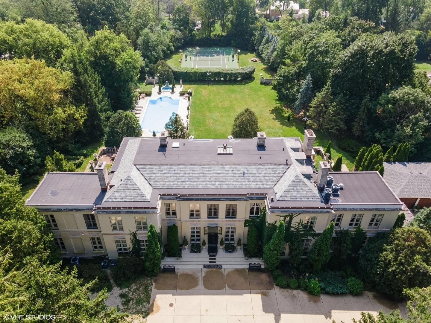 Introducing “The Adler,” a magnificent French country estate, set on over two acres of breathtaking grounds in Lake Forest. Built by renowned architect David Adler in 1914, this 11,000 sq ft estate embodies timeless elegance. The property features an incredible grand foyer, parlor, library, media room, and an elegant kitchen with an additional service kitchen. With eight spacious bedrooms and ten bathrooms, this home is the epitome of sophistication and grandeur. Inside, you’ll find grand chandeliers, ornate moldings, 11-foot ceilings, herringbone parquet floors, and custom marble throughout. The home also boasts luxurious 24kt gold Sherle Wagner bathroom fixtures, adding an extra layer of refinement. This French country-style estate offers resort-like amenities, including a swimming pool, spa, tennis court, and formal gardens. Owned by only four families throughout its history, the property retains a rich legacy and unmatched allure. The living room and dining room overlook the lush gardens, while the library, with its paneled walls, provides a secluded retreat for work or relaxation. The second floor hosts all eight bedrooms on one level, while the third floor offers an entertaining space complete with a “speakeasy” bar, dance room, sauna, and full bath. For car enthusiasts, The Adler features a three-car garage. Surrounded by mature trees and lush landscaping, this estate offers the ultimate in privacy and serenity. “The Adler” is truly a masterpiece of architectural design and historical significance in Lake Forest.