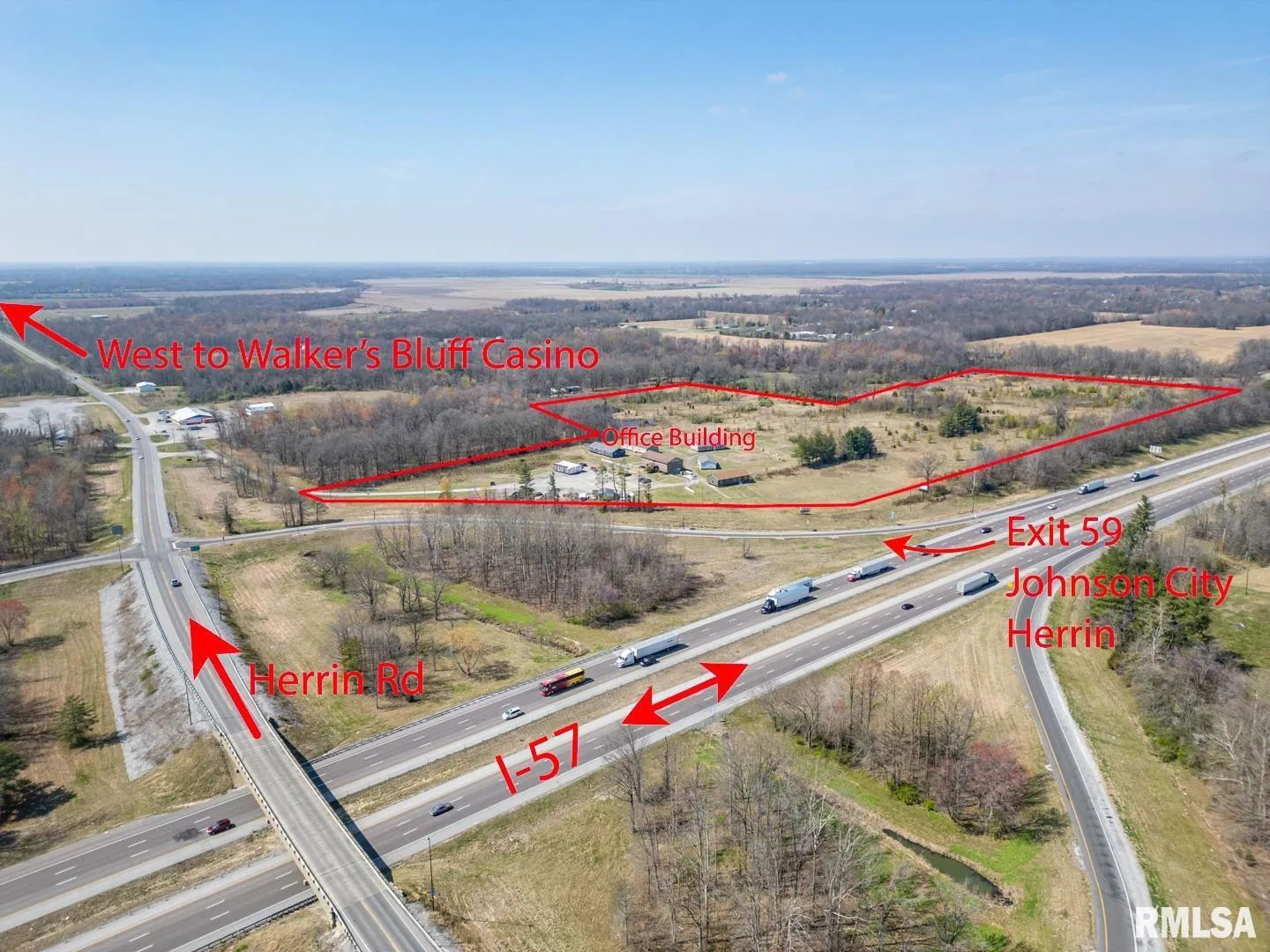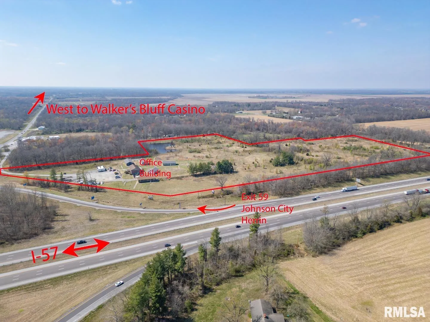 23.82 acres for sale or lease located at the Northwest corner of the I-57 exit 59 Johnston City. Just five minutes north of Marion, IL exits. Over 40,000 cars a day on the recent six lane expansion of I-57. TIF incentives available, all city utilities available. Zoned B-2 Primary Business District now, but it could be changed. Located at the Official exit off I-57 for the Newly opened Walker’s Bluff Casino & convention center located approximately 20 minutes west of this exchange. Excellent location for a truck stop, hotel, restaurant, or strip mall. 660 feet of I-57 frontage available. A modern two-story brick building on the property is now being used as a showroom and office space. An additional 17.65 acres is available for sale or lease. Will divide and sell or lease the ground. Current address is 11478 Imhoff Lane, Johnston City, IL 62951
