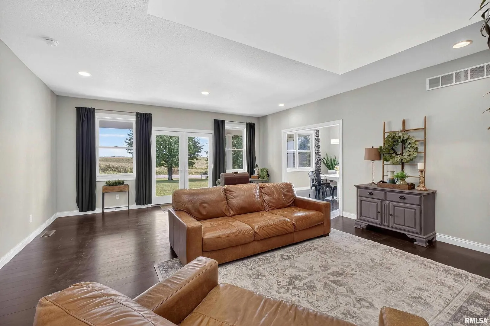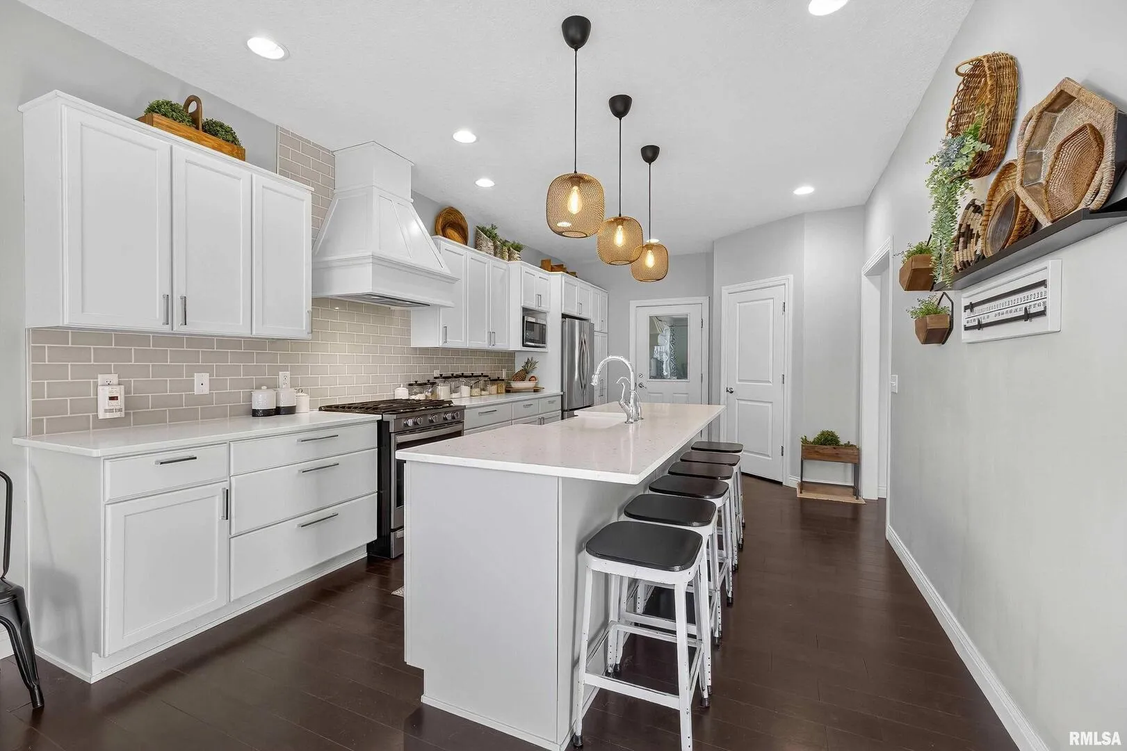 Enjoy country living only minutes from city amenities & Scott County Park & lake making this ideal for outdoor living or hobby farm! Modern farmhouse located in North Scott School District with 6 bedrooms, 4 baths & nearly 4000 sq ft of living space on almost an acre lot. Be impressed the moment you enter from either the front or back covered porches to find a spacious open floor plan with dramatic & unique 2 story cupola to allow natural southern exposure light to illuminate both levels plus cozy fireplace. Gather many in spacious kitchen with beautiful cabinetry, ample quartz counter top space & island plus designer tile & walk-in pantry. Six spacious bedrooms include a Primary suite featuring 2 walk-in closets, ensuite with 2 vanities, tiled shower & private water closet plus a main floor bedroom & full bath for convenience. Expand to the lower level with large rec room plumbed for a wet bar, wired for surround sound & projector plus bedroom, bath & home office space. Oversized 3 car gives you plenty of storage. The .87 acre lot allows for chickens or other many other animals (chickens can be included), multiple fruit trees, grape vines, raspberries, raised gardens & bee hives PLUS a 46×96 concrete sport court to use for basketball, tennis, pickleball or many other uses. Other features include: whole house water filtration system w/carbon filter, iron curtain, water softener, RO system, Hardie cement fiber siding & more!