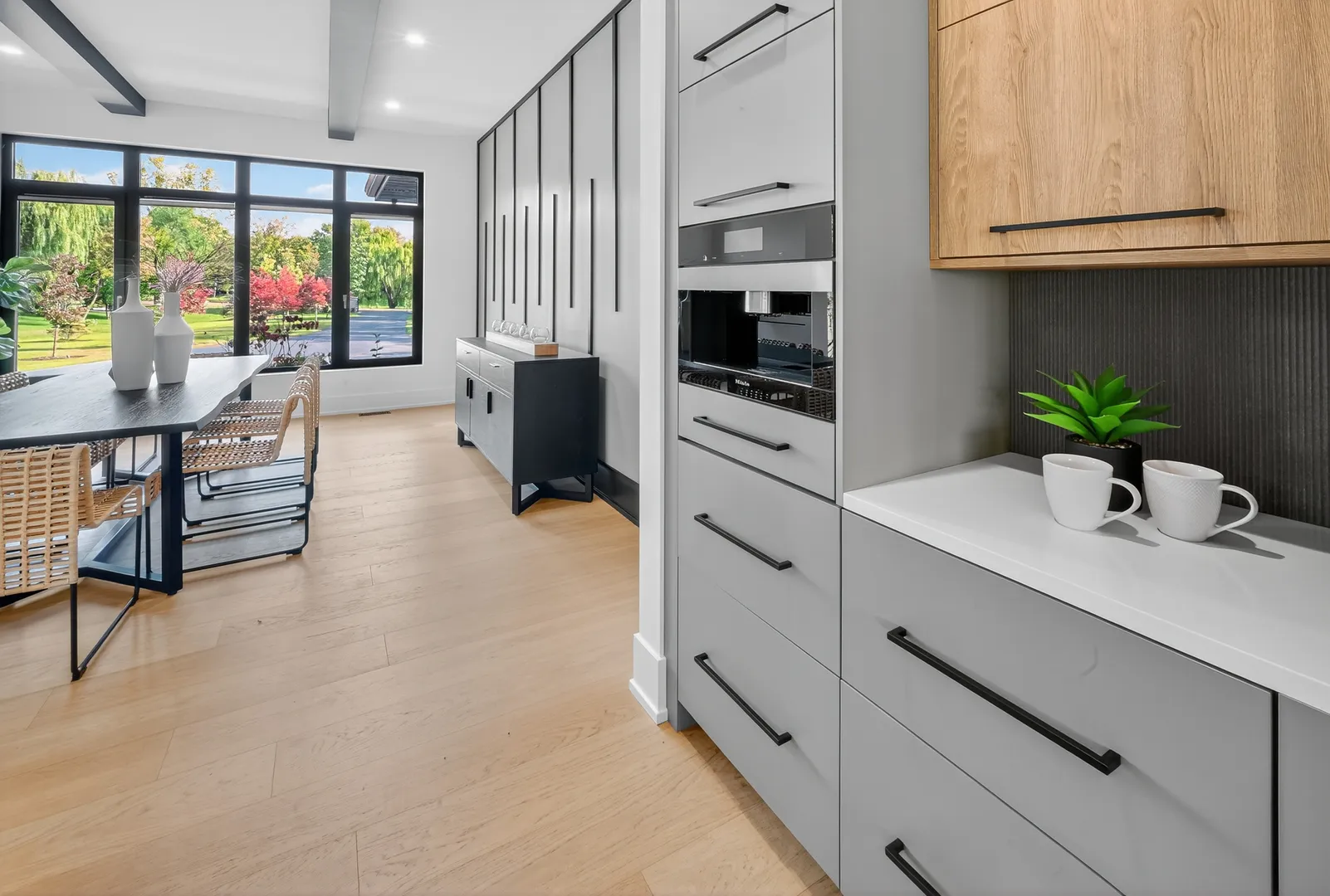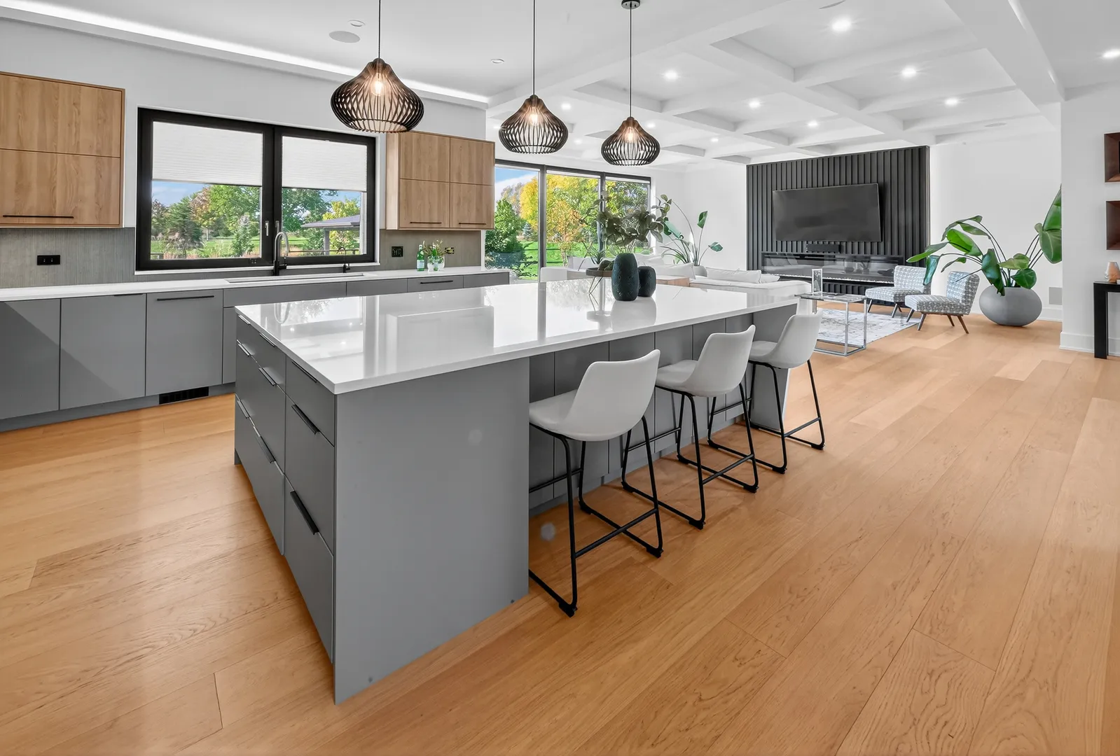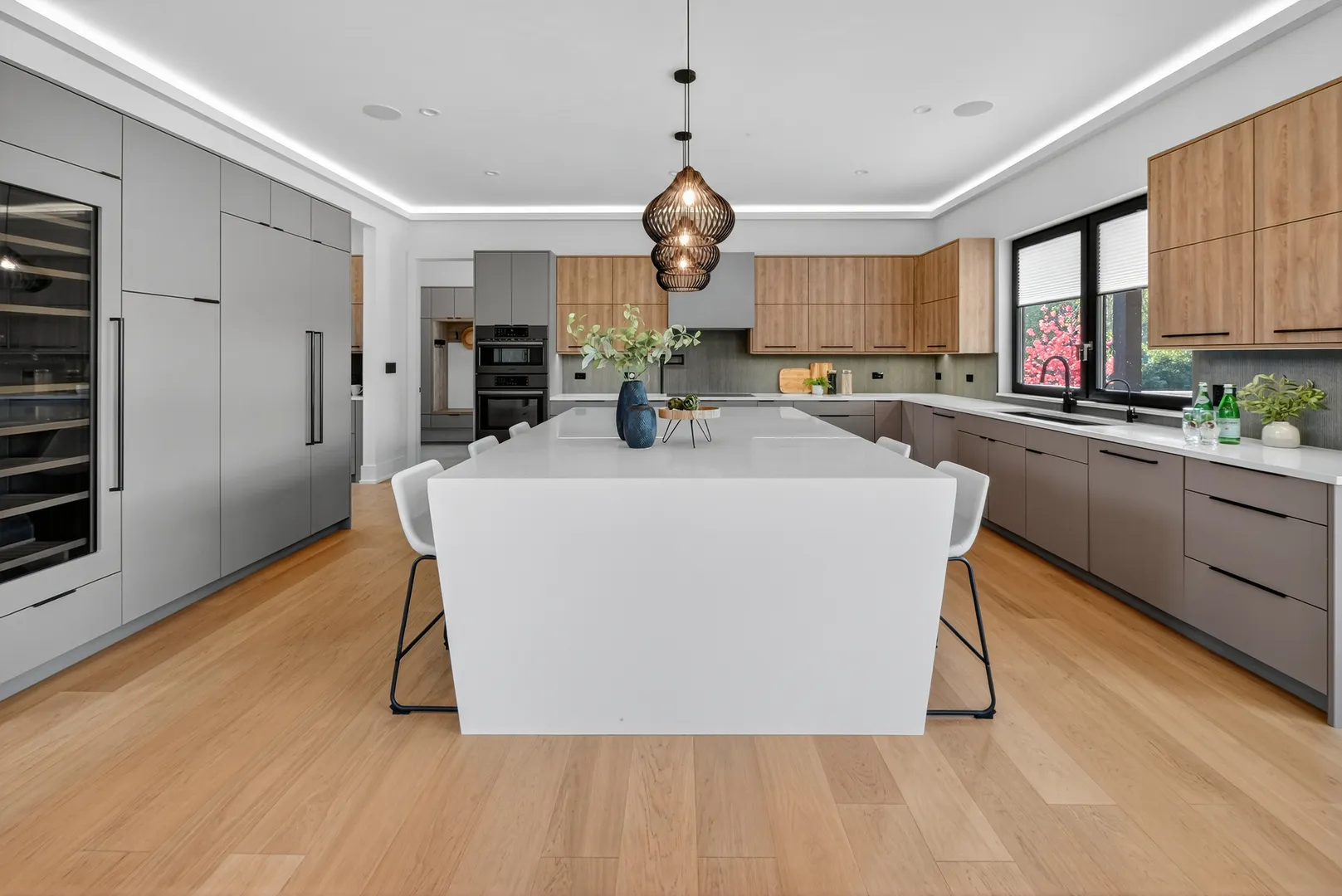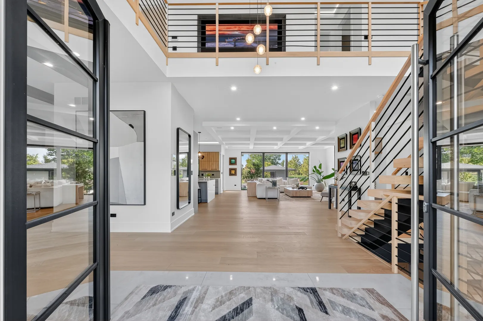 Modern luxury meets private resort living on 5+ acres just north of Spring Lake Trails in Barrington Hills. Built in 2023, this custom 5BR/5.1BA estate offers over 6,000 sq ft of light-filled living with a striking glass entry, two-story foyer, and expansive European windows overlooking the pool and grounds. The chef’s kitchen features a quartz waterfall island, premium appliances, and Miele coffee station-perfect for entertaining. Outdoor living shines with a saltwater pool, hot tub, outdoor kitchen, hardscaped firepit, and pool house. The private primary suite includes a spa bath with heated floors, soaking tub, and dual walk-in closets. English lower level with bar, guest suite, steam shower, and fitness room. Heated 5-car garage with EV charging plus new 24×50 outbuilding. Minutes to Barrington and Metra.