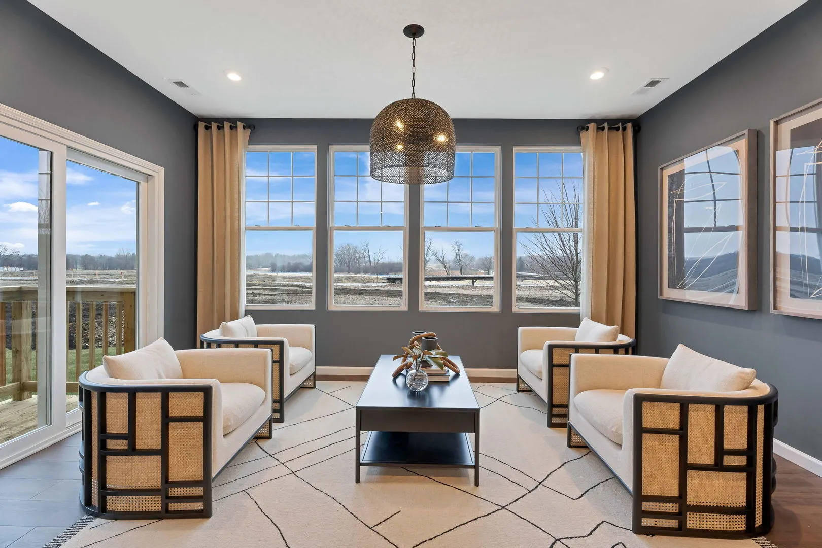 Welcome home to Rivers Edge! walking distance to Main Street and Seven Bridges. THIS HOME IS TO BE BUILT. The Provence ranch duplex offers an open concept with an integrated kitchen, cafe and gathering room. Your beautiful new Provence welcomes you to the great room, cafe and kitchen area, a great space for family and friends to gather. You have a bright airy year-round sunroom off the great room that expands your living area and is next to the 16×10 patio. Your beautiful gourmet kitchen includes white cabinets, Quartz counters, a beautiful tile backsplash and bronze finishes. You also have the kitchen convenience package including soft close drawers and cabinet doors with pull out shelves and separate bins for trash. All this and built-in SS appliances. Your large island has room for seating and bronze pendant lighting plus you have a pantry for extra storage. Your spacious owner’s suite is tucked away for your complete privacy and has a large walk-in closet. Your ensuite bathroom has a double bowl vanity with Quartz counters and a separate tiled shower with glass doors. The laundry room comes with cabinets and a sink. Smart Home technology package included. This Provence includes the optional finished loft with bedroom and full bath, rail and wrought iron stairway, bright airy sunroom, bay window at cafe, and other upgrades. Photos of similar home shown with some options and finishes not available at this price. Homesite 14001.