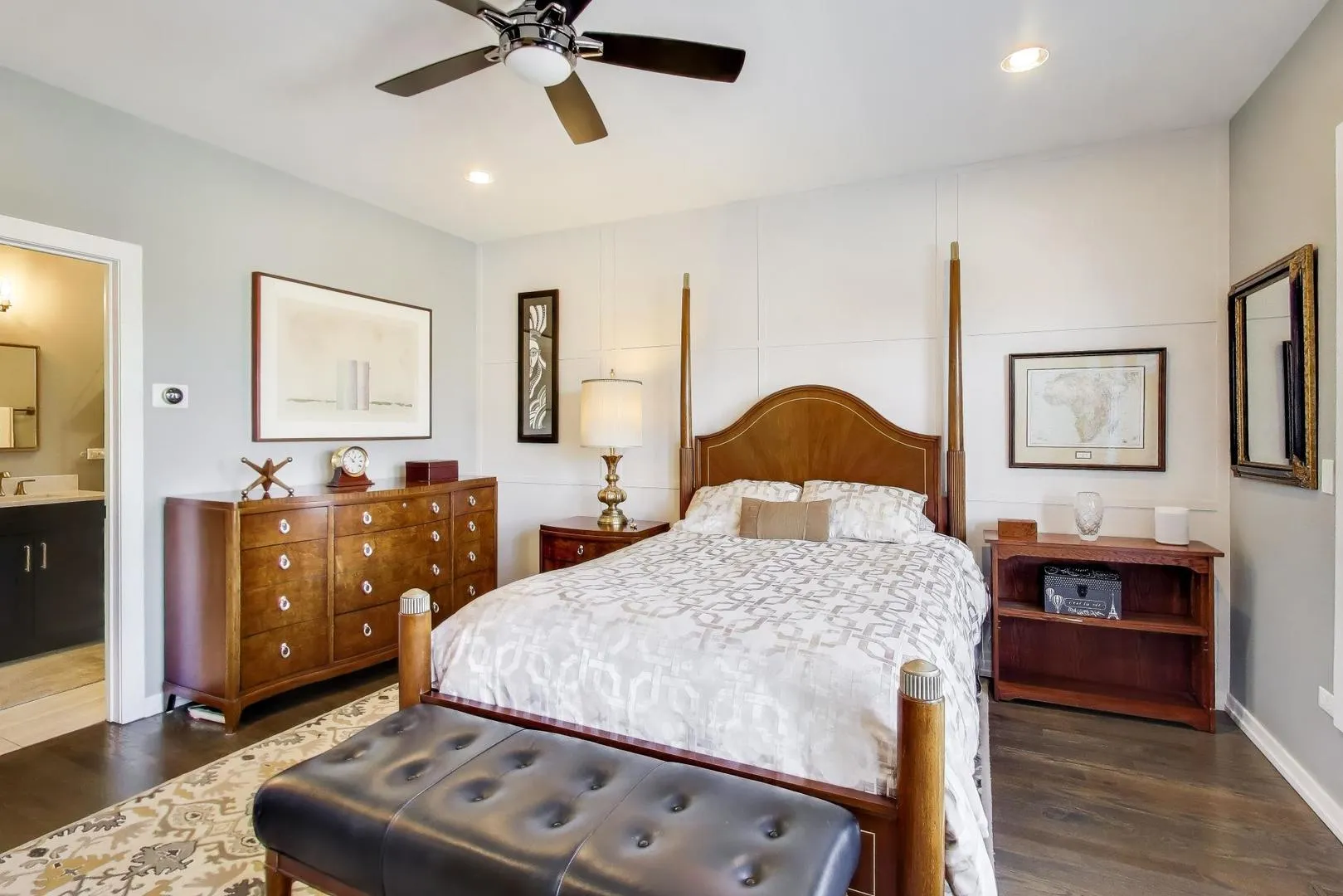 This beautifully maintained, newer-construction home offers modern design, quality craftsmanship, and refined finishes throughout. The exterior features a brick facade, walk-out balconies, and an attached two-car heated garage, delivering both style and everyday convenience. Inside, you’ll find oak hardwood floors, a striking paneled accent wall in the dining area, and custom wood window blinds throughout. The open-concept main level is an entertainer’s dream, highlighted by a gracious kitchen and great room featuring white shaker cabinetry, quartz countertops with a waterfall edge, a marble backsplash, stainless steel appliances, and elegant brass lighting and plumbing accents. The thoughtfully designed layout includes a first-floor bedroom suite with a stunning entry foyer-ideal for guests or multigenerational living. Upstairs, the primary suite offers a true retreat with a spa-like bath featuring a rain shower and a private walk-out balcony. Two additional bedrooms, a full bath, and custom closet systems complete the upper level. Enjoy seamless indoor-outdoor living with a welcoming porch, walk-out balconies off both the living room and primary bedroom, and a fenced rear yard perfect for entertaining, relaxing, or play. Move-in ready and impeccably finished-this is Bronzeville living at its finest.