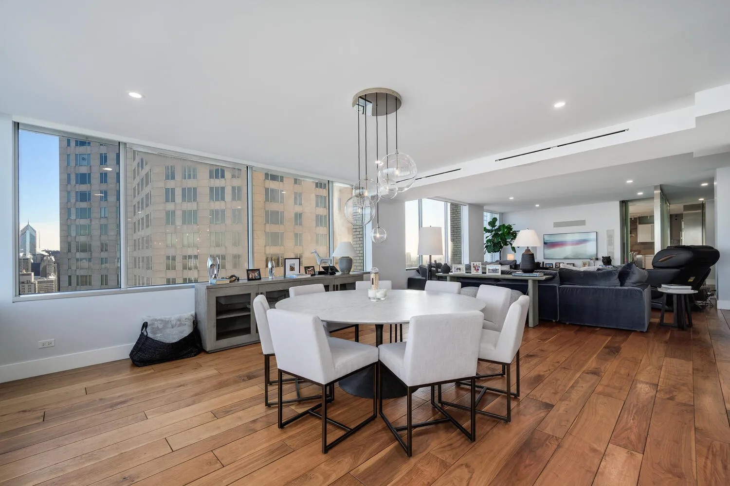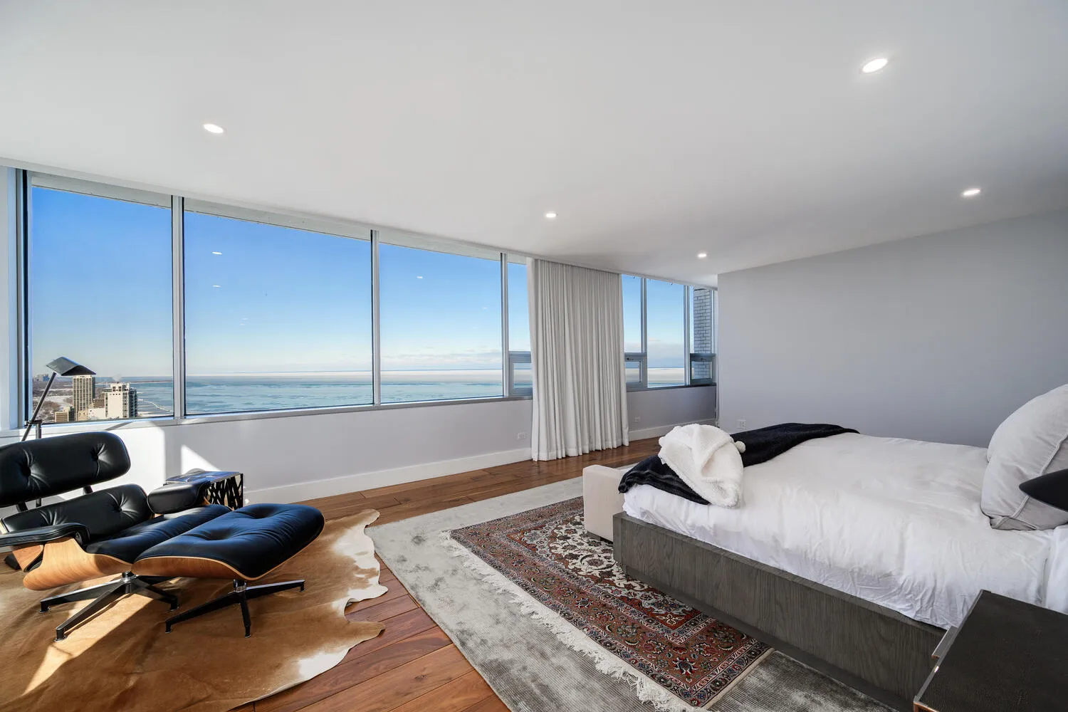 Perched on the 47th floor at the iconic intersection of Lake Shore Drive and Oak Street, this full-floor luxury condominium for sale in Chicago’s Gold Coast offers a rare combination of scale, privacy, and unobstructed views. Spanning approximately 6,600 square feet, the residence delivers refined, high-rise living in one of Chicago’s most prestigious neighborhoods. This exceptional home features two expansive 50-foot private terraces with 360-degree panoramic views of Lake Michigan and the Chicago skyline, creating an extraordinary indoor-outdoor living experience seldom found in Gold Coast condominiums. The residence includes five bedrooms, four full bathrooms, and two powder rooms, all within a fully renovated smart home outfitted with luxury finishes throughout. Design highlights include hand-scraped walnut hardwood floors, curated designer lighting, and meticulous craftsmanship in every room. The oversized primary suite functions as a private sanctuary, complete with a dramatic walk-in closet and dressing room, a dedicated office, and a spa-inspired white marble bathroom designed for comfort and retreat. The Bulthaup chef’s kitchen is both sculptural and functional, featuring gorgeous countertops, a full Sub-Zero wall of refrigerators and freezers, premium integrated appliances, and custom cabinetry. The layout is ideal for everyday living as well as large-scale entertaining. Located within a full-amenity luxury building, residents enjoy an unbeatable Gold Coast lifestyle just steps from Oak Street Beach, the lakefront, world-class shopping, and renowned dining. This is a rare opportunity to own a full-floor luxury condo in Chicago’s Gold Coast, offering iconic views, premier amenities, and an irreplaceable Lake Shore Drive address.
