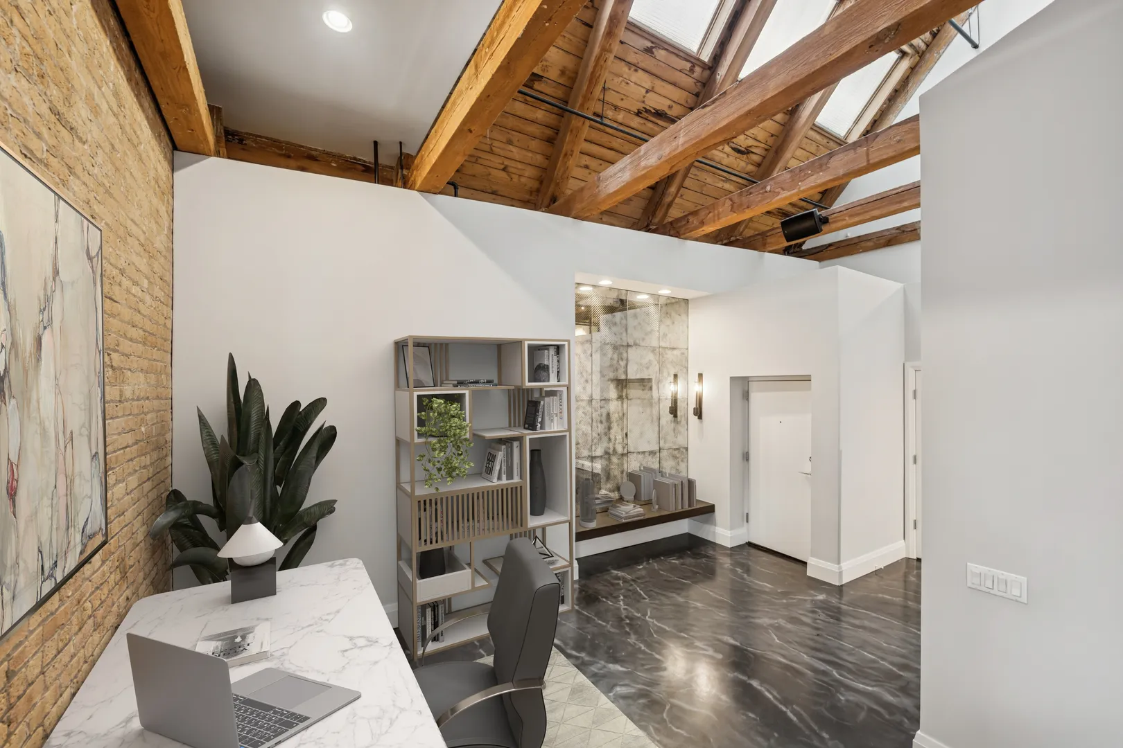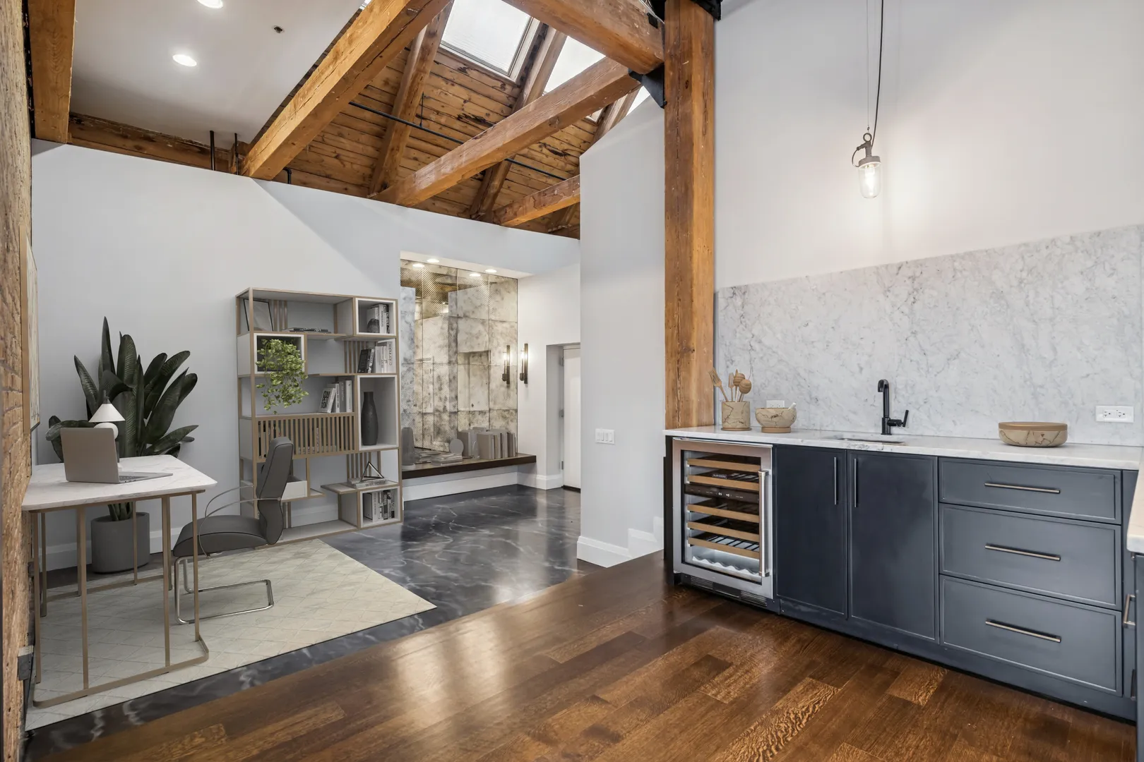 Residence 436-437 is a one of a kind, authentic exposed brick and timber loft in a former book bindery and warehouse building first erected in 1882 in the heart of the West Loop, Randolph’s Restaurant Row, retail stroll and Fulton Market. Residence 436-37 offers 3,400 square feet on one 1 level of decadent space where the northeast corner walls are all brick and large commercial grade windows, exposed 17′ timber ceilings, exposed timber columns and metal collars and remnants, original and restored copper door leads out to 15′ recessed brick and concrete terrace from living space which spans 50′ feet in width. 7″ wide plank white oak, quarter sawn hardwood floors throughout in Jacobean finish. A statement foyer with polished concrete floors, pitched 45 degree angle ceiling with 8 skylights, exposed timber, smoked-etched glass back drop and floating bench, custom wall sconces and enormous walk-in coat closet. Just freshly painted throughout in very light grey, all white trim, 5″ baseboards. Entertainer’s dream kitchen featuring SubZero wine fridge, Chef’s pantry, imported French La Cornue high output 5 burner range, double oven, La Cornue vented hood, Miele dishwasher, Sharp microwave drawer, commercial size Viking side by side fridge/freezer. Hand crafted custom, finest wood cabinetry with all dovetail joints, soft close and very large lower drawer storage. 1.25″ straight edge, Statuary marble counters and large slab backsplash. Wet bar, Franke sink. Floating, metal, layered cocktail bottle/stemware rack descends from the ceiling. Massive and commanding 14′ kitchen island with 6″ Hawaiian Koa wood counter, stainless steel farm sink, black plumbing fixtures, disposal. Living/dining areas include a gas ventless fireplace, unobstructed views of the West Loop, city scape, Randolph Street’s Restaurant Row, military grey, floor to ceiling draperies of finest fabric. Primary bedroom with massive solid wood sliding panel door and steel I beam, back drop wall of re-purposed wood. Private balcony. Walk-in closet with built-ins. Primary bathroom dressed in large format rectangular greystone tiles, furniture piece dual vanity, contemporary, low profile rectangular vessel sinks, black plumbing fixtures, wall hung mirrors, gold vertical wall sconces, heated floors, steam shower, bench, infinity drain, recessed niche. Transom windows in bathroom for refreshing natural light source. Second full bathroom features penny floor tile, solid Statuary marble block sink, black and satin nickel plumbing fixtures, soaking tub/shower combination. rain shower, frameless glass. All closets with built-ins. A 12+, Triple AAA rated turnkey, stellar residence with the highest end finishes in one of the most sought after neighborhoods in the nation. 1000 West is a 24 hour doorman building with onsite engineer, maintenance staff and property manager. Two prime side by side parking spaces, additional storage locker, bike storage and internet service are included in rent. Available immediately.