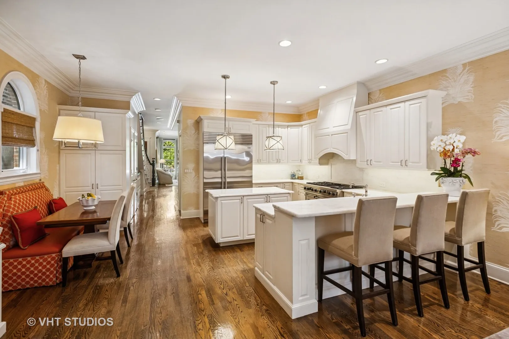 Step into the timeless elegance of 2103 N Clifton, a distinguished 5 bedroom, 4.2 bath home in the heart of Lincoln Park. This 5000 SF residence combines classic architecture with a flexible floor plan perfect for today’s lifestyles. The gracious living room features arched windows, impressive moldings and fireplace flowing seamlessly into the formal dining room with bespoke butler’s pantry. Gourmet kitchen boasts timeless white cabinetry, marble countertops, professional-grade appliances, center island and eat-in breakfast area. The adjacent family room is infused with warmth and character by an inviting fireplace and coffered ceiling. Second level primary suite features a generous walk-in closet, custom built-ins, and spa-inspired bath. Two generously-sized, secondary bedrooms share the hall bath. Top floor showcases a penthouse recreation room, office/bedroom, full bath, two private rooftop decks and convenient laundry room. Lower level offers exceptional entertaining space with a large recreation room, custom built-ins, powder room, guest suite with ensuite bath and abundant storage. Outdoor living shines with the professionally landscaped front yard, private backyard patio with built-in gas grill ideal for al fresco dining. Don’t miss the sport court above the two-car garage. Just steps to Oscar Mayer Elementary, Trebes Park, and Armitage Avenue’s shops, restaurants, and El station. This property delivers walkability, neighborhood charm, and the enviable lifestyle of urban living.