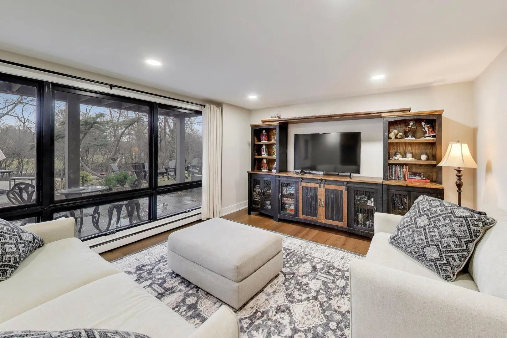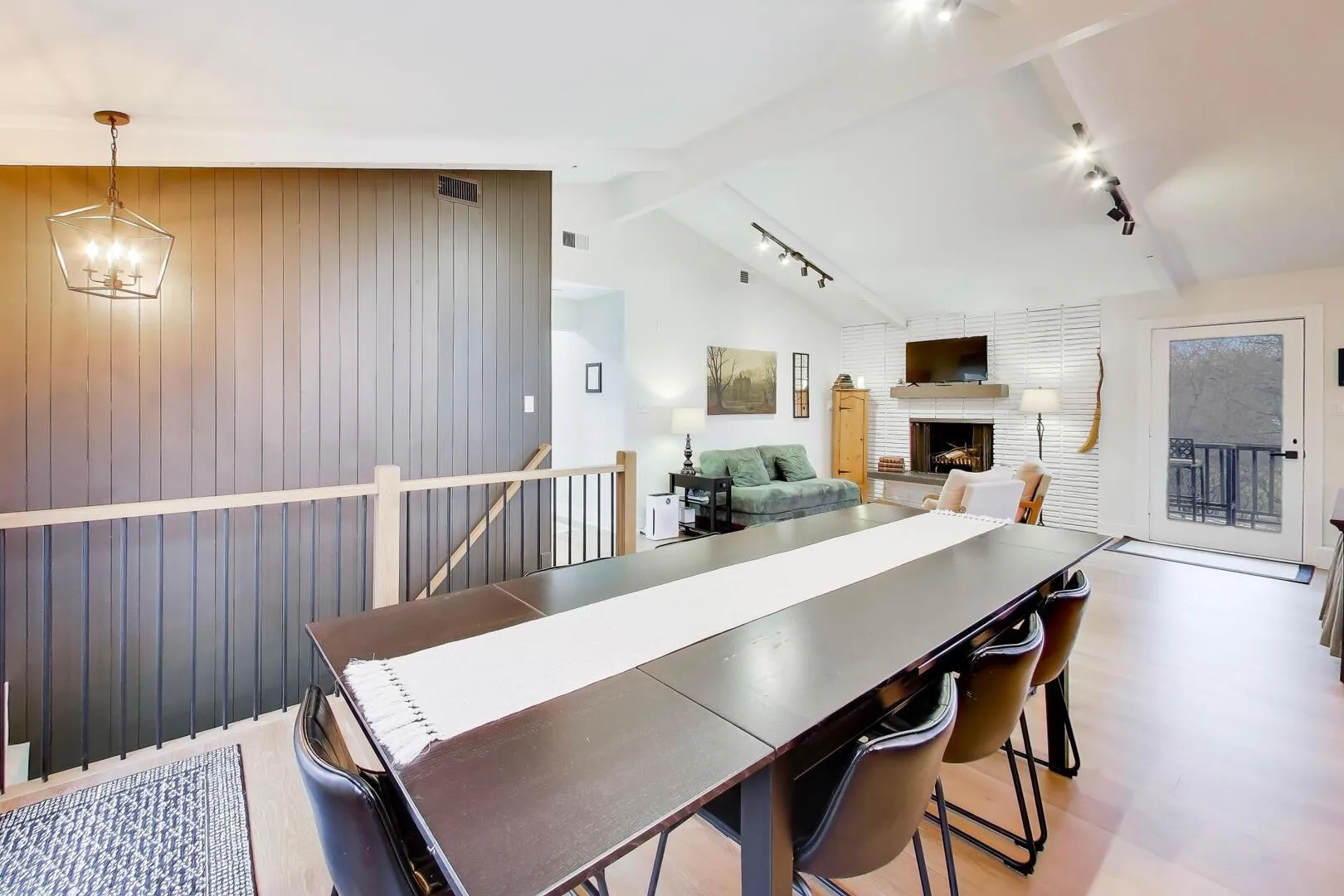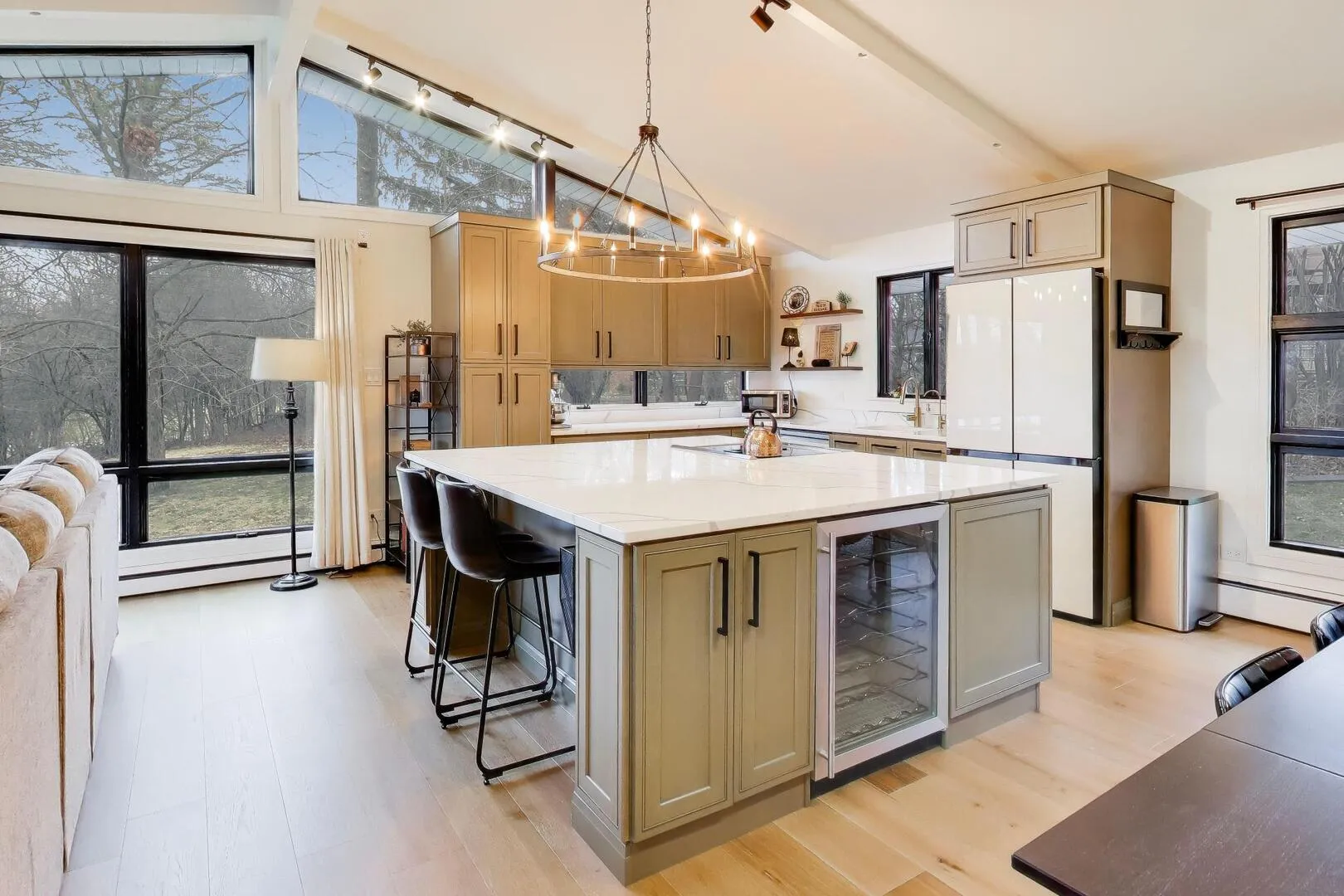Situated on a generous 1.2-acre lot, this beautifully renovated all-brick home offers 5 bedrooms and 3 bathrooms across 2,600+ square feet, located in desirable Barrington 220 school district. The thoughtful layout blends mid-century modern character with modern updates throughout. Upon entering the home, you’re welcomed on the lower level by a cozy family room with a wall of floor-to-ceiling windows. This level also includes flexible living space along with two additional bedrooms and a full bathroom, making it ideal for guests, a home office setup, or extended family living. The main level showcases the home’s standout feature: an expansive living room with soaring ceilings and large panoramic windows where natural light pours in and frames beautiful views of the surrounding nature. This open-concept space flows seamlessly into the gourmet kitchen and spacious dining area, creating the perfect setting for both everyday living and entertaining. The stunning kitchen boasts a large island, quartz countertops, abundant cabinetry with phenomenal storage space, and sleek Samsung appliances. The dining space comfortably accommodates seating for twelve without feeling crowded. Generous living area offers a flexible and open floorplan perfect for entertaining with a 2nd updated full bathroom conveniently located adjacent to the space. Two additional bedrooms and your primary suite are tucked away at the end of the hall. The primary bedroom boasts an update en-suite bathroom completing this level. Recent renovations bring a fresh, modern feel throughout the home, including new three-panel interior doors, updated trim, and a striking staircase. Engineered oak hardwood flooring and elegant tile work add warmth and durability to the living spaces. For outdoor enjoyment, the home features an extra-large balcony that provides a peaceful setting for relaxing or entertaining while overlooking the surrounding property. The expansive yard offers endless possibilities to create your own outdoor retreat, whether that’s a patio, garden, or full backyard oasis. Additional updates include a new water softener and iron filtration system, adding comfort and functionality to this already impressive home. With extensive renovations already completed, the home is truly move-in ready. Located in the highly sought-after Timberlake Estates, the property also offers lake rights and views of the community beach located just off the driveway, allowing you to enjoy lake living while still being conveniently located just 8 minutes from downtown Lake Zurich. Listing agent is related to the seller.