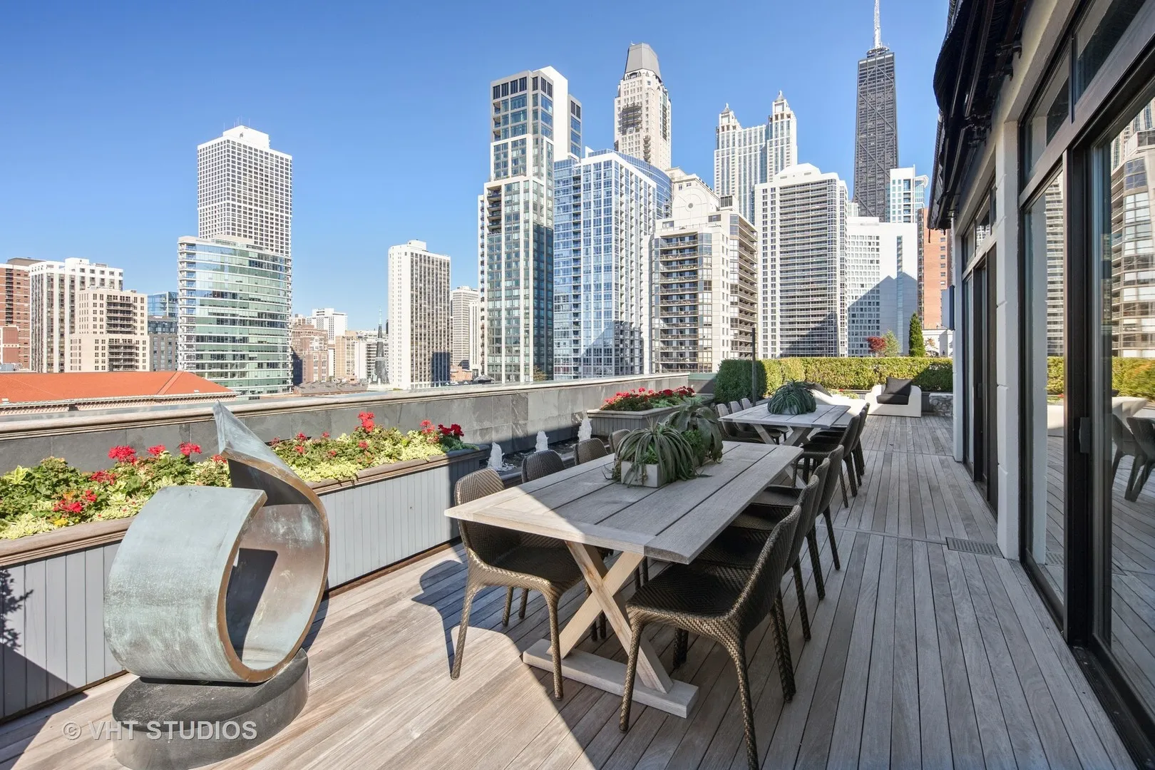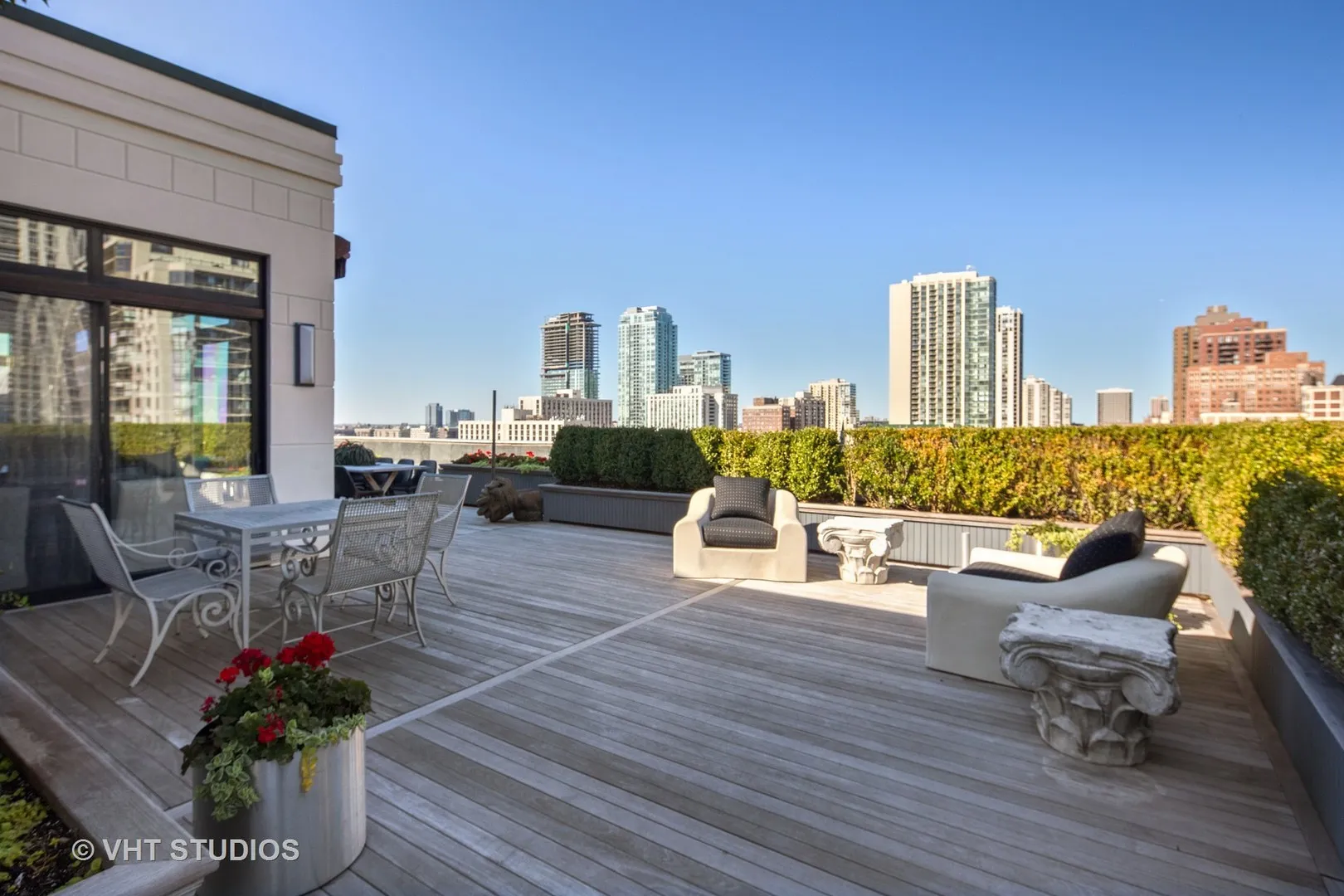 Exceptional two-story penthouse in Chicago’s prestigious Gold Coast offering approximately 5,500 square feet of luxury living space, a private in-unit elevator providing convenient access to both levels, and an expansive approximately 2,300-square-foot Ipe rooftop terrace with beautiful skyline and Washington Square Park views. This sophisticated residence features 3 bedrooms, 4 full bathrooms, 1 powder room, and 4 ventless gas fireplaces thoughtfully positioned throughout the home. The main level showcases Hauteville antiqued French limestone flooring, an elegant foyer anchored by a dual-sided ventless gas fireplace, spacious living room with an additional fireplace and north-facing balcony overlooking Washington Square Park, and a formal dining room ideal for entertaining. The chef’s kitchen is appointed with honed Carrara marble countertops, stainless steel cabinetry, Viking, Sub-Zero, and Gaggenau appliances, breakfast bar, separate eating area, and large walk-in pantry. The primary suite serves as a private retreat featuring separate his-and-her full bathrooms and separate walk-in closets, premium Kallista fixtures, Ann Sacks tile, Duravit toilets, and a steam shower. A graceful curved staircase and the private in-unit elevator both provide access to the second level, offering exceptional entertaining space including a great room with ventless gas fireplace, media room, second kitchen with wine storage, full bathroom, and direct access to the expansive 2,300-square-foot private rooftop terrace-ideal for indoor-outdoor living and entertaining. Additional features include Lutron Maestro lighting controls, automated window treatments, built-in A/V sound system, two oversized handicap-accessible parking spaces, and two large walk-in storage rooms. Premier Gold Coast location directly overlooking Washington Square Park and steps from Oak Street shopping, lakefront, fine dining, and top-rated schools including Ogden International School and Latin School of Chicago.