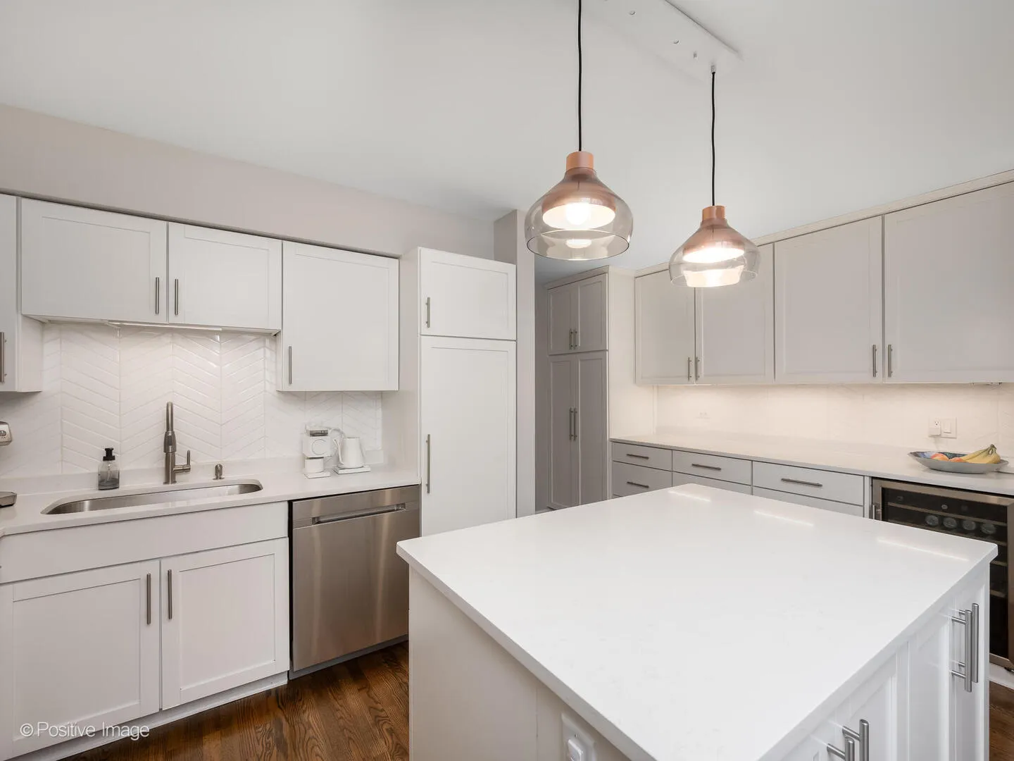 Exceptional 3 bed / 2 bath townhome offering three levels of refined living in an amazing part of Wicker Park. Flexible first level features a bedroom, full bath, side-by-side laundry, and private patio with trex decking-ideal for guest suite, office, gym, or family room. The main level showcases a beautifully updated kitchen with white shaker cabinetry, quartz countertops, stainless steel appliances, double pantry, and oversized island, seamlessly opening to an expansive living/dining area anchored by a dramatic fireplace. Top floor includes two bedrooms, highlighted by a spacious primary suite with walk-in closet and a beautiful, recently renovated en-suite bath. Thoughtful upgrades throughout include designer lighting, custom handrails, and organized closets. Two parking spaces included (attached garage + exterior). Well-run association with low assessments. Prime tree-lined Julian St. location near North, Damen, Division, Milwaukee Ave, parks, dining, shopping, nightlife, and everything else this AMAZING LOCATION has to offer.