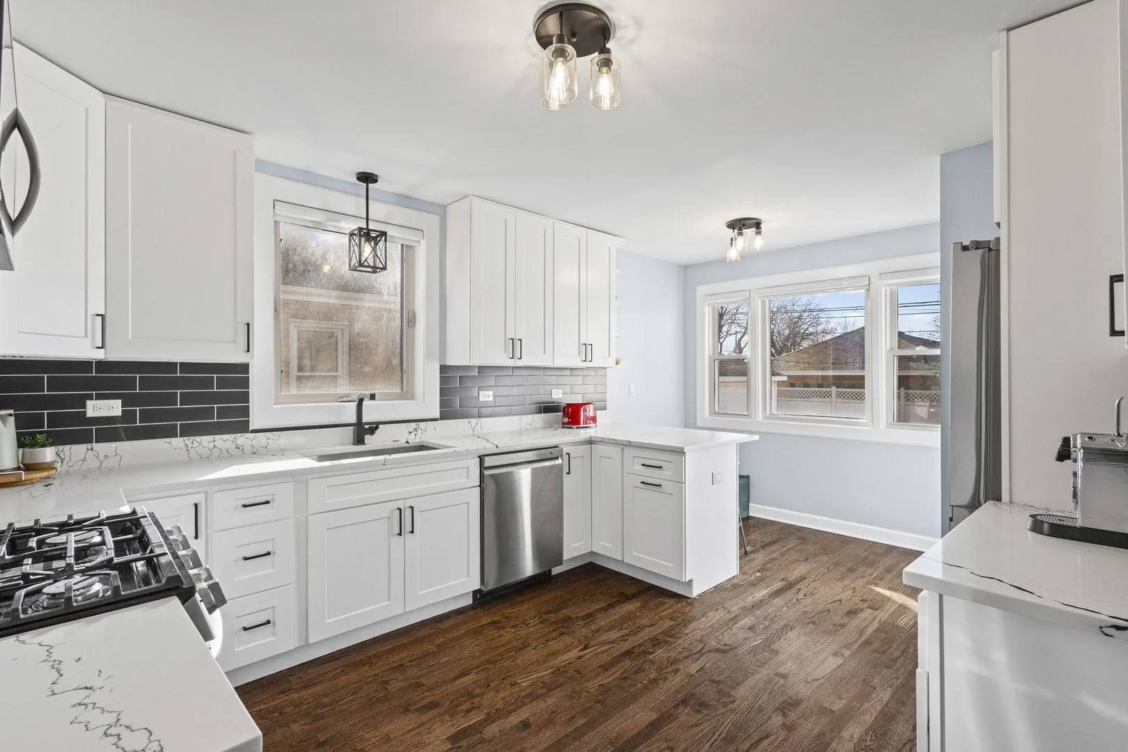 Fabulous move-in ready designer home! This beautifully updated property offers 5 bedrooms and an ideal layout for comfortable living. The main level features two bedrooms, including a spacious primary suite on the first floor, providing convenience and privacy. One of the bedrooms is currently configured as a custom walk-in closet but can easily be converted back to a bedroom if desired. The home is filled with great natural sunlight and showcases hardwood floors throughout, elegant crown moldings, and a separate formal dining room perfect for entertaining. The designer kitchen features quartz countertops and LG stainless steel appliances, blending style and functionality. The finished basement adds valuable additional living space, while the fully fenced yard and 1-car garage provide both comfort and practicality. For added peace of mind, the home includes security cameras. Located in the highly sought-after Fairview School District and offering easy access to the highway, this home combines luxury, location, and convenience.