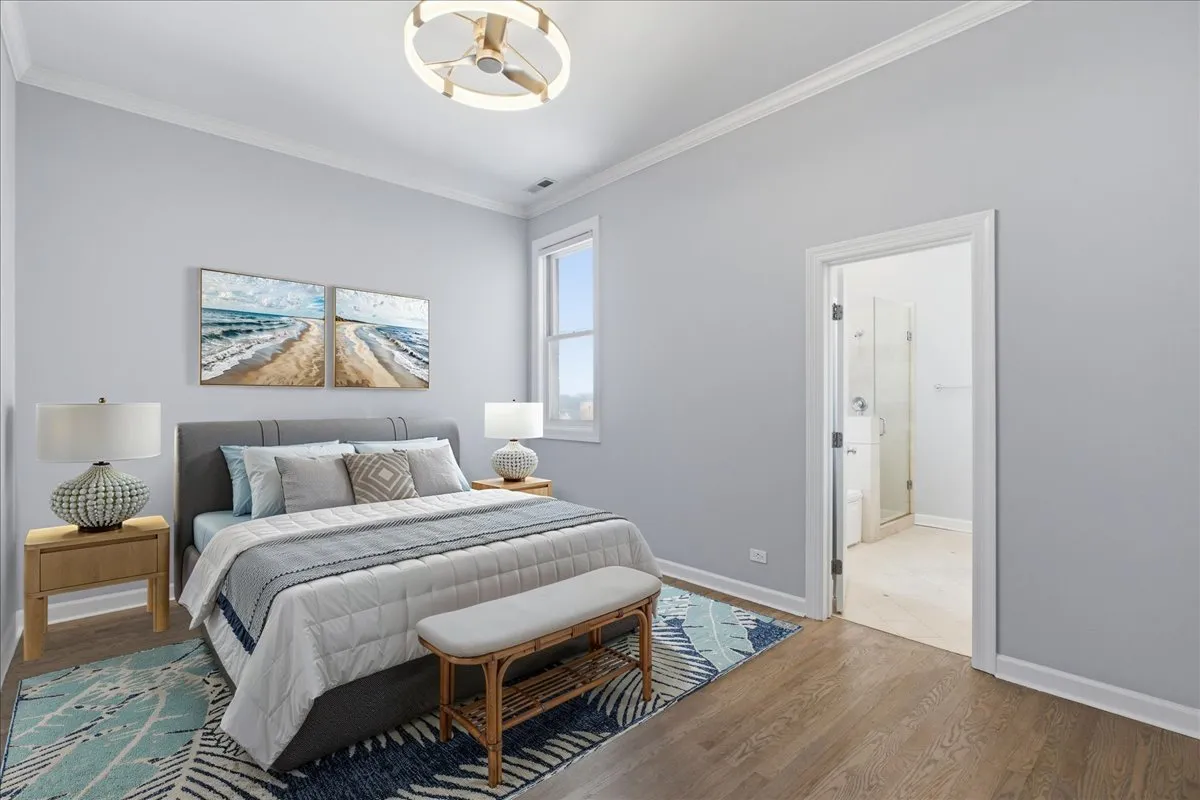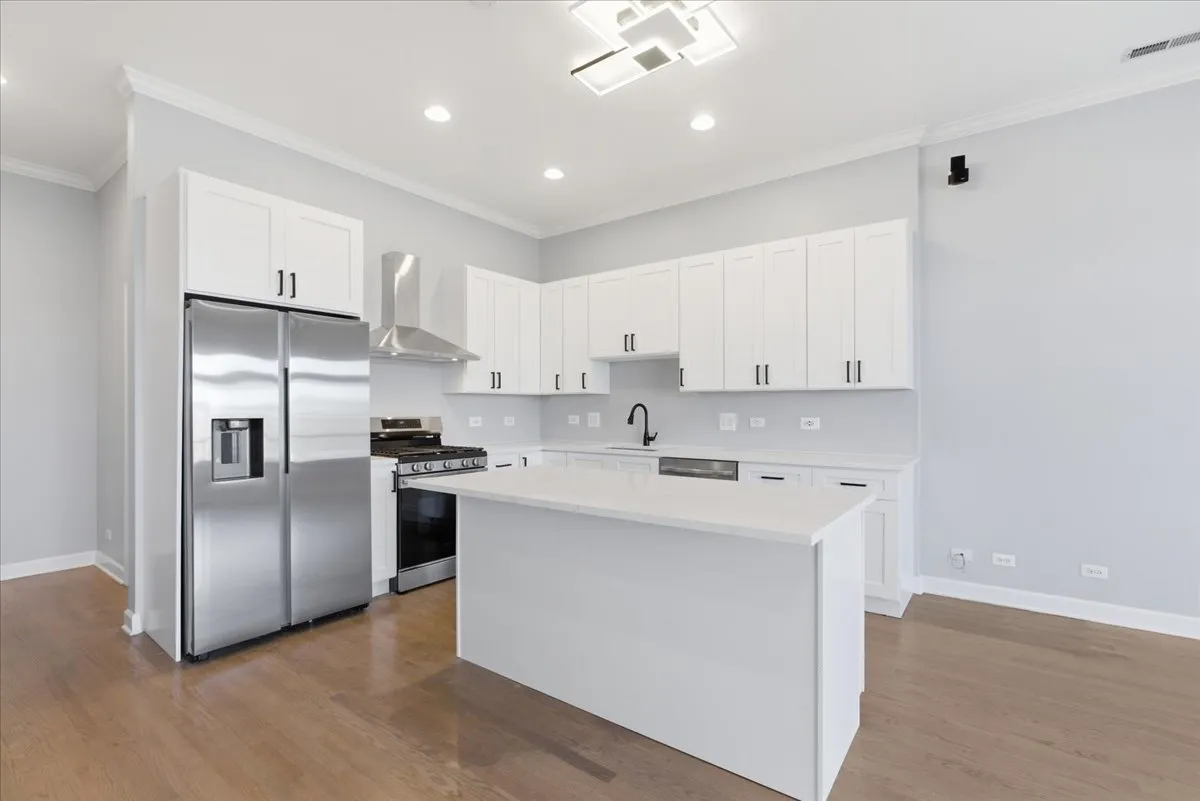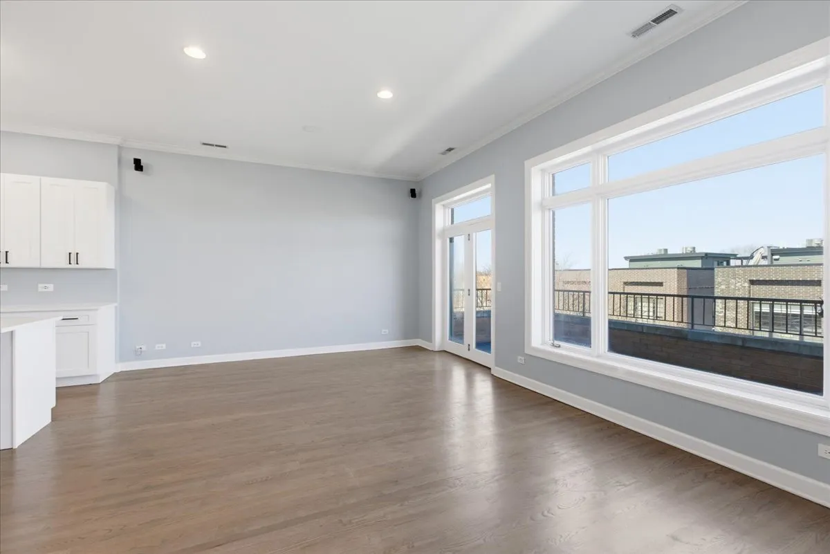Enjoy a prime Roscoe Village location in this beautifully updated 3-bedroom, 2-bathroom condo featuring multiple outdoor spaces, including PRIVATE ROOF RIGHTS! This desirable open-concept layout is filled with natural light from large windows and showcases dark-stained hardwood floors, crown molding, recessed lighting, and an inviting gas fireplace with a charming mantel. The living and dining areas flow seamlessly and open to a spacious private terrace-perfect for grilling or enjoying your morning coffee. The brand-new kitchen (2026) is designed to impress with white cabinetry, an oversized eat-in island, and stainless steel appliances. The spacious primary suite offers walk-in closet, a spa-like ensuite bathroom complete with dual vanity, glass-enclosed shower, and tub. The second bedroom is versatile, ideal for a home office or guest room, and features sliding doors to a private balcony with updated composite decking. The third bedroom includes generous closet space. Additional highlights include in-unit washer/dryer, a dedicated storage room, garage parking included in the price, and brand new roof (Oct 2025). Truly move-in ready and ideally located near the shops and restaurants of Roscoe Street, with easy access to public transportation, parks, and neighborhood entertainment.