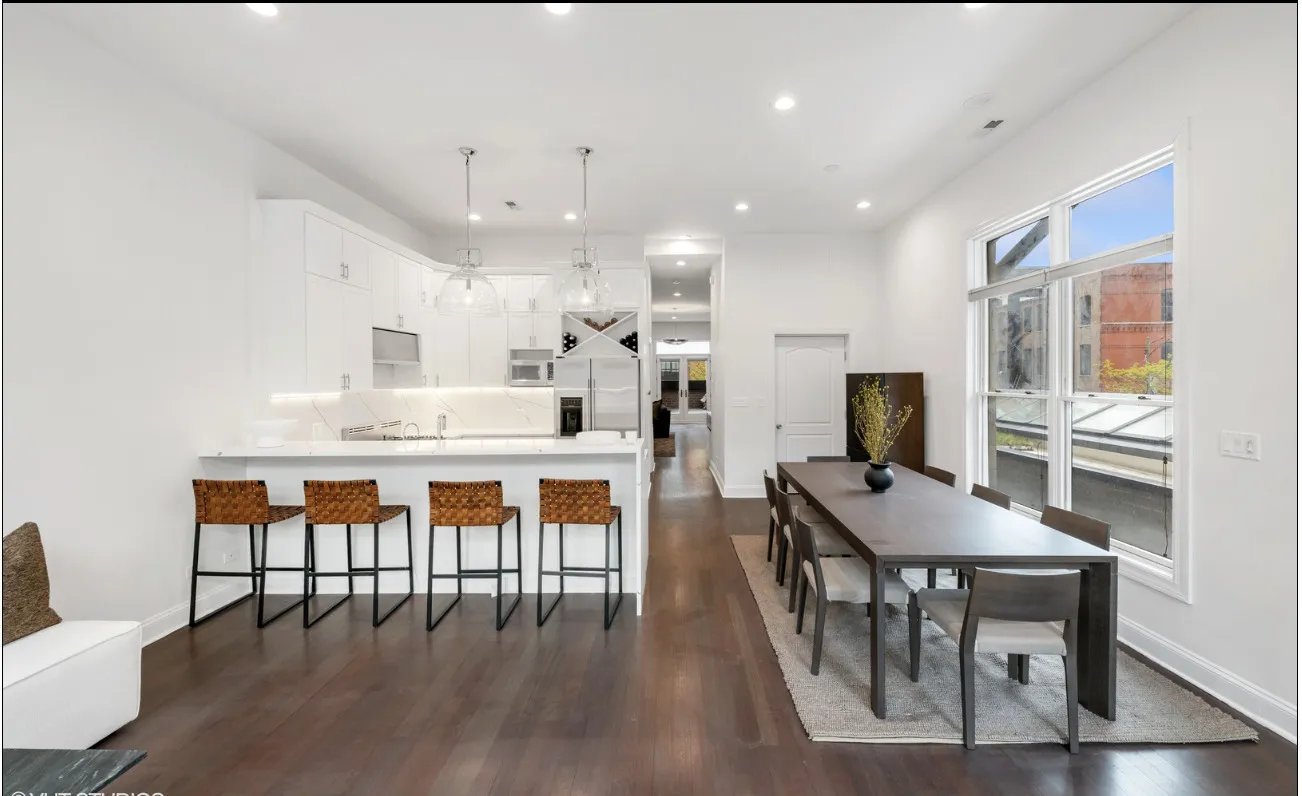 Stunning one-of-a-kind unit in the heart of Fulton Market. This private oasis lives like a single-family home with amazing city views. Recently updated, the duplex features a beautiful chef’s kitchen with quartz countertops, high-end stainless steel appliances including Fisher & Paykel Chef stove and fridge, 42″ tall shaker cabinets, and a matching backsplash. All windows throughout the unit are equipped with up-down custom blinds. Spacious family room with a built-in fireplace perfect for entertaining. Incredible outdoor space with a 35×32 private deck and built-in stainless steel grill and countertop, as well as a separate balcony overlooking Green St. On the top floor of the unit, you will find all 3 bedrooms. Your large primary bedroom, separate from the other bedrooms, features a large walk-in closet with custom built-out shelving as well as a 5 piece bathroom. On the remainder of the top floor, you will find the 2nd and 3rd bedrooms, a full bath, and a laundry room with extra storage space. With a walk score of 97 you can enjoy all the amazing restaurants, bars, and shopping Fulton Market and West Loop has to offer. Transit options include easy access to the Green, Pink, and Blue lines, Ogilvie and Union Station, 90/94, and 290. Nearby grocery options include Marianos, Whole Foods, and Jewel-Osco. Skinner Elementary School. 2 GARAGE PARKING SPOTS INCLUDED. Available 5/4/26