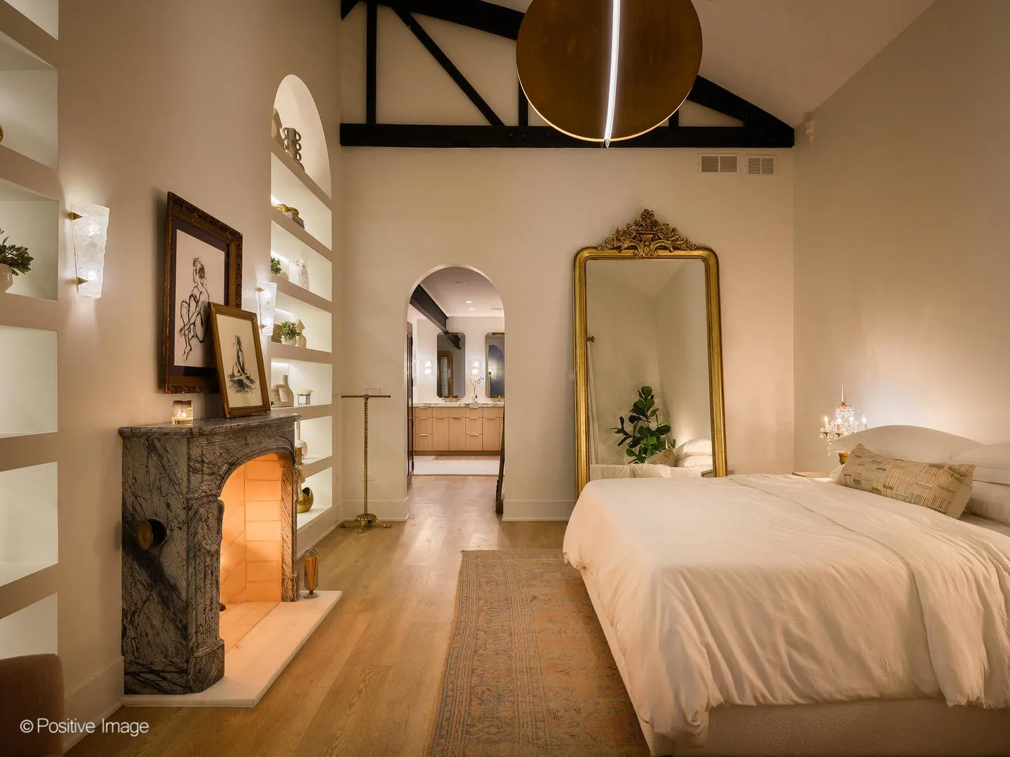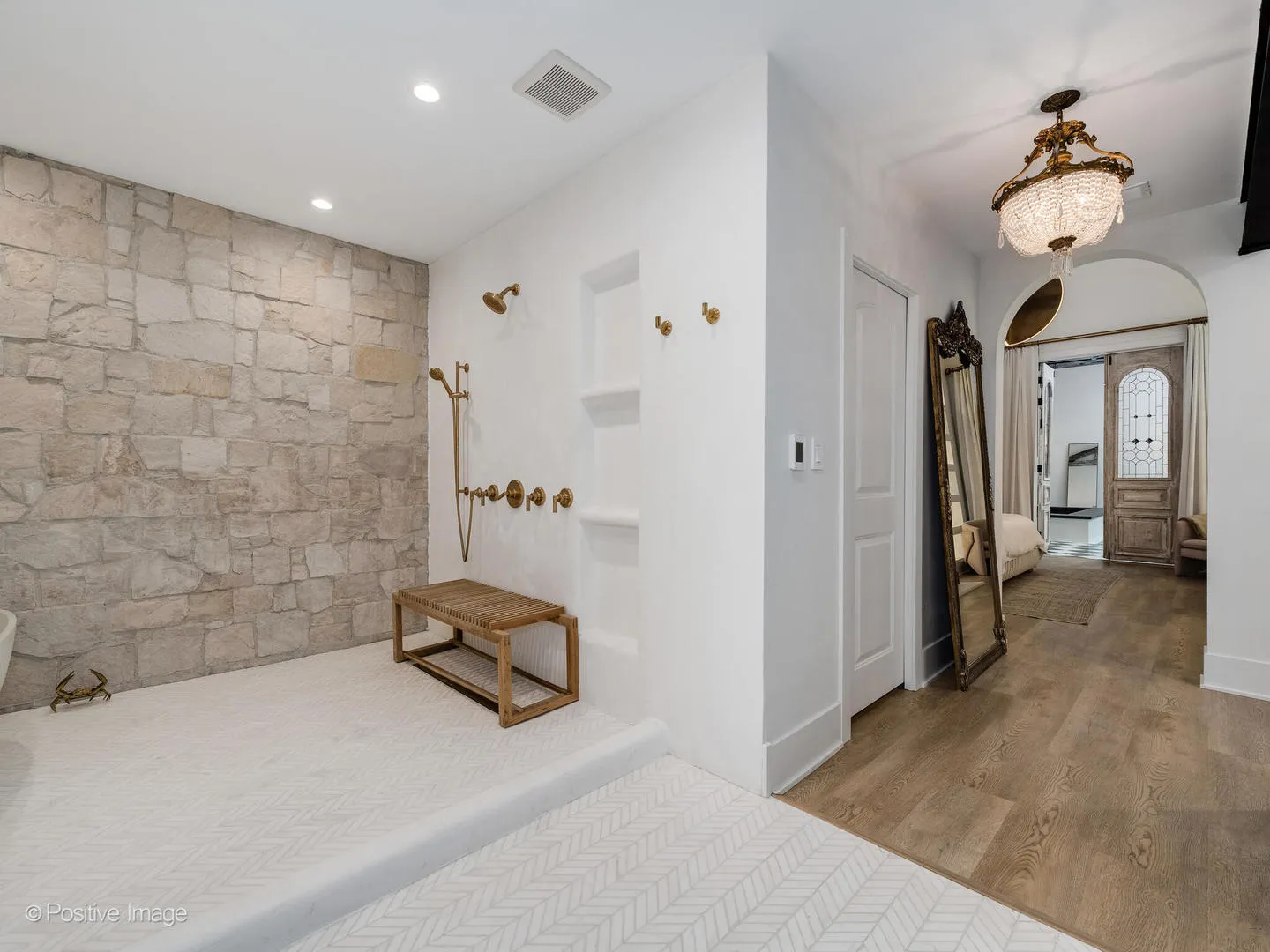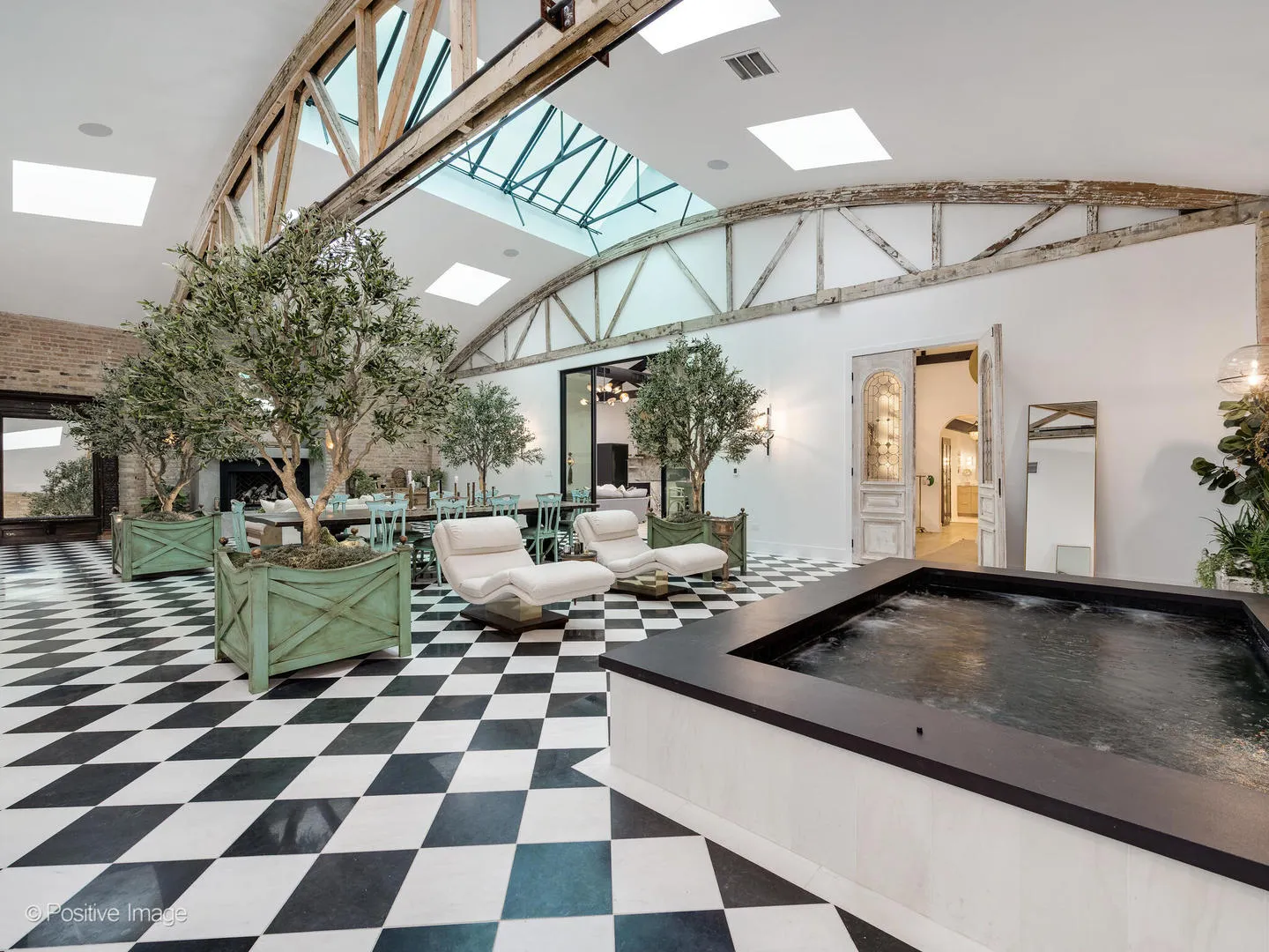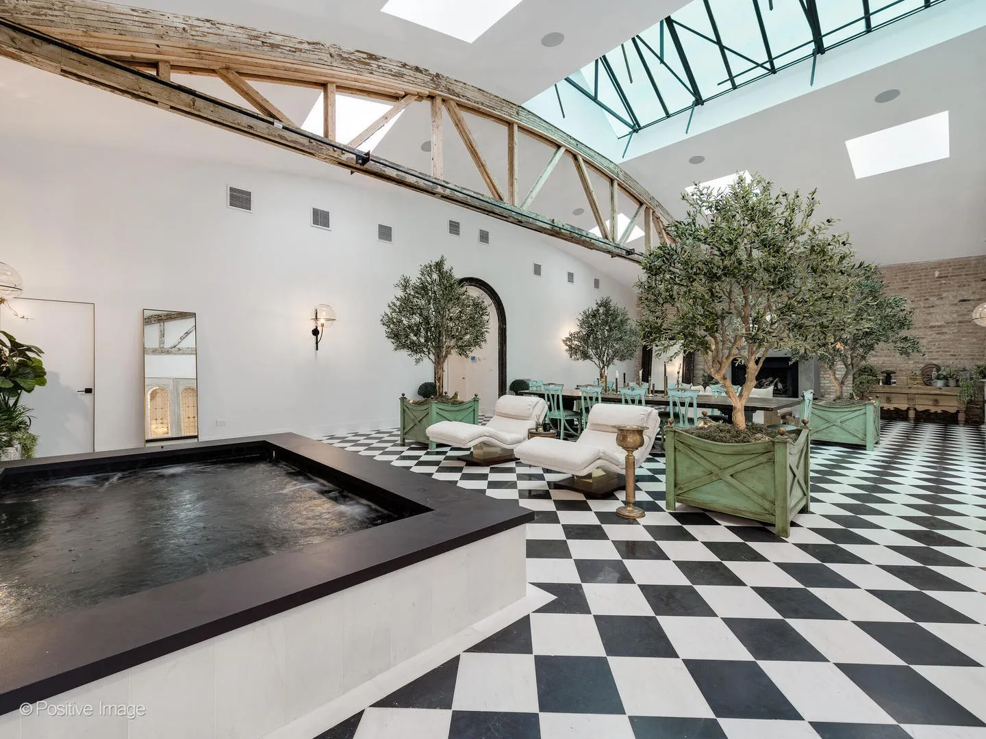 Explore the unmatched elegance of 2733 N Pulaski Road, where HGTV’s Alison Victoria has transformed a historic bowtruss building into a Parisian-inspired live-work sanctuary in Logan Square West. Its discreet facade belies the opulent 7,000+ square feet of living space within. From the street, your first enter a dedicated work haven with its own bedroom/separate office and full bathroom, offering a seamless blend of work, comfort, and versatility. Pushing through antique French doors, you step into the residential part of the home, a space where grandeur and comfort converge. The open-layout dining area is first with ceilings soaring over 20 feet high and sleek floor to ceiling onyx cabinetry complete with a library ladder. Adjacent to the dining area lies the kitchen, a testament to culinary luxury with its earthy veined, built-in cabinetry and floating shelves that echo the elegance of the Calcutta turquoise marble waterfall island. A chef’s dream, featuring a fully custom marble sink, an oversized marble-lined cabinet niche, and equipped with top-quality designer appliances such as a Thermador MicroDrawer Oven, TWO full-size wine fridges, a Dacor wine dispensing unit, a Miele espresso machine, and a 60-inch double-oven range, full-size refrigerator and freezer columns, and dishwasher all by BlueStar. There’s a cozy theater room, a stylish powder room and, moving further, an incredible custom-crafted bar seamlessly connecting to the tranquil living area and creating an ideal venue for social gatherings. Reaching the core of the home, you have an awe-inspiring courtyard atrium. This central sanctuary features heated marble floors, an expansive 80-foot skylight, and supplemental pyramid skylights, creating an extraordinary indoor-outdoor ambiance unique to Chicago. Dominated by a ‘spool,’ a combined spa and pool-and encircled by faux olive trees and Parisian antique furnishings, the atrium offers a captivating old-world European allure with a roaring gas fireplace. Off the courtyard is a well-equipped workout room with rubber flooring and mirrored walls. There’s a mud room with an infrared sauna and TWO separate heated 2-car garages. Crowning the main floor’s luxurious offerings is the primary suite, embodying understated elegance and subtle allure. A cozy stone fireplace, framed by built-in recesses, anchors the space. Beautifully restored stained glass doors open into the atrium directly, inviting the leisurely charm of a serene, holiday-like retreat right within the room. The en-suite bathroom is expansive, featuring a spacious wet room with a natural stone accent wall, waterproof plaster, and herringbone tile heated floors. A wood-fronted vanity is adorned with a thick marble top and an under-mount sink, complemented by luxurious finishes and warm metal accents. Two custom walk-in closets complete the ensemble, with one thoughtfully equipped with an LG ThinQ washer & dryer for added convenience. On the second level are two additional bedrooms that share a stunning bathroom featuring floor-to-ceiling tiling & a marble vanity. Completing the floor is a traditional linen closet along with an additional storage closet already set up for a secondary washer and dryer if desired. The home’s design combines historic elements with modern functionality, including an Energy Recovery Ventilation system for improved air quality and energy efficiency. Located in the vibrant West Logan Square, this unique property offers a blend of old-world craftsmanship and contemporary luxury. Its live-work zoning, proximity to amenities, and integration into a community rich in culture and convenience, make 2733 N Pulaski Road the choice for those seeking a sophisticated yet functional urban living experience.