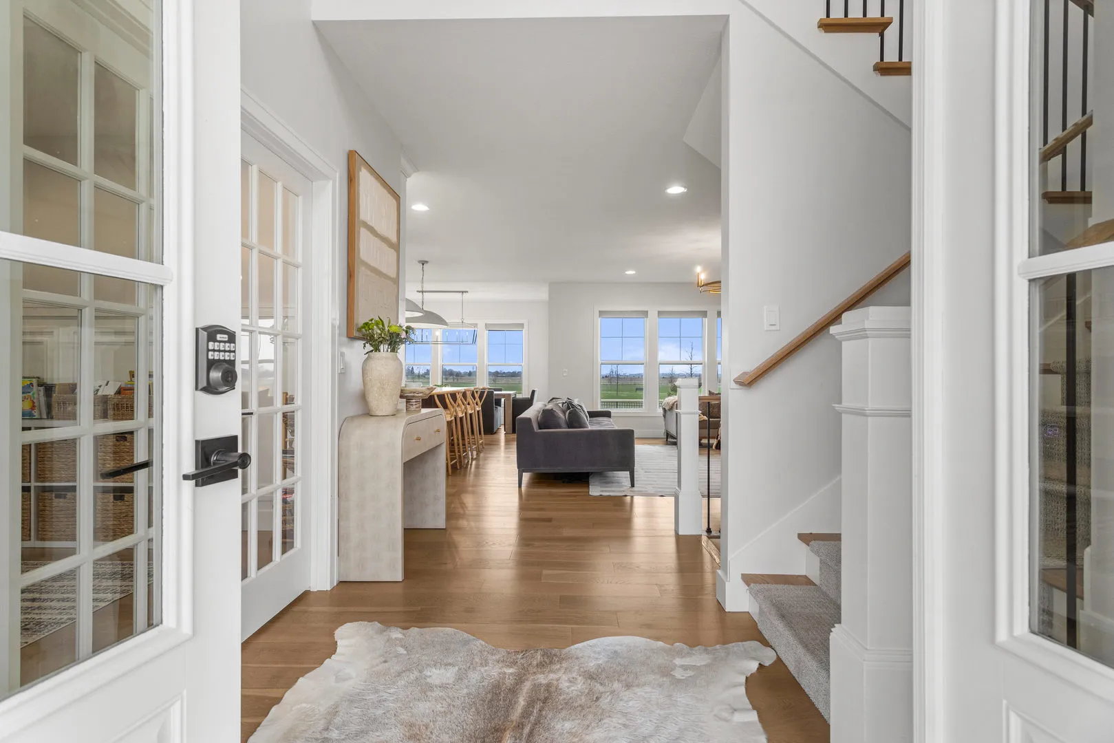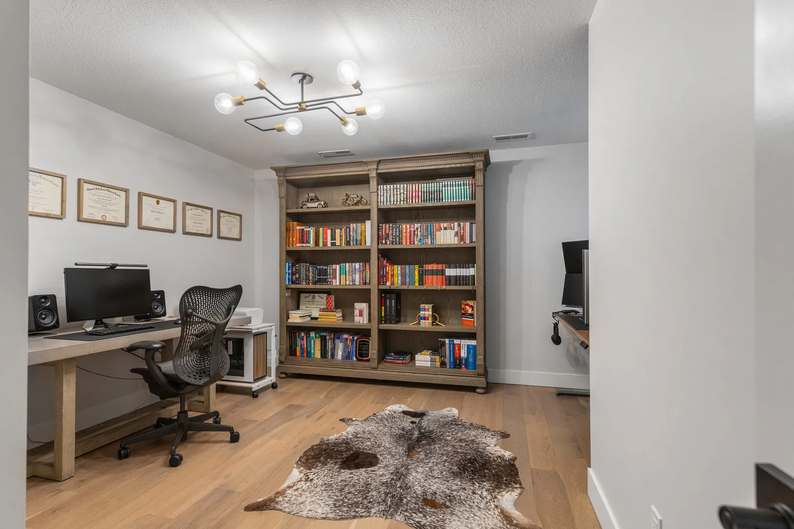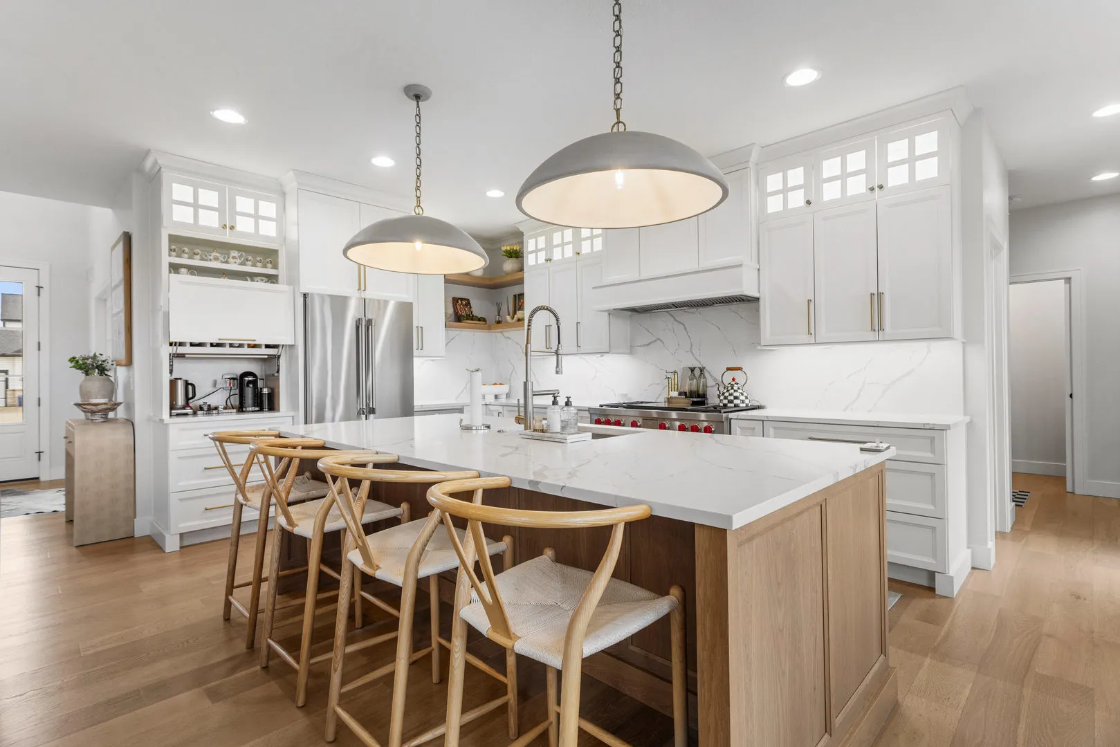 Welcome to 4814 Oakdale, where thoughtful design and truly high end finishes set this home apart from anything else on the market. This is not your typical build. Every detail has been carefully selected and upgraded to create a stunning, one of a kind space. The kitchen is a true showpiece featuring quartz countertops with a full matching backsplash, beautiful hardware, a Wolf dual fuel range with double griddle, Thermador refrigerator and microwave, Bosch dishwasher, walk in pantry, and a convenient appliance garage. Studio McGee lighting over the island and an Arhaus fixture in the dining room add designer touches that elevate the entire space. Hardwood flooring runs throughout the entire home, including the second level, creating a seamless and elevated feel. Custom built ins anchor the living room, and motorized Bali blinds add both comfort and convenience. Natural light pours in from every angle. A main level flex room, currently used as a playroom, offers endless possibilities for a home office, sitting room, or formal space. The mudroom drop zone is thoughtfully tucked away, keeping everyday life organized and out of sight. The finished basement adds a fifth bedroom, full bath, designated workout room, and a spacious second living area perfect for movie nights or hosting guests. Outside, the extremely large corner lot offers both space and privacy, with the fenced backyard backing directly to a park and providing beautiful open views. Professional landscaping with irrigation and a drip system surrounds the home, creating incredible curb appeal. The three car garage provides plenty of space for vehicles, storage, and hobbies. From the designer lighting to the high end appliances and extensive upgrades throughout, this home delivers a truly luxurious feel. It is stunning, unique, and absolutely a must see.