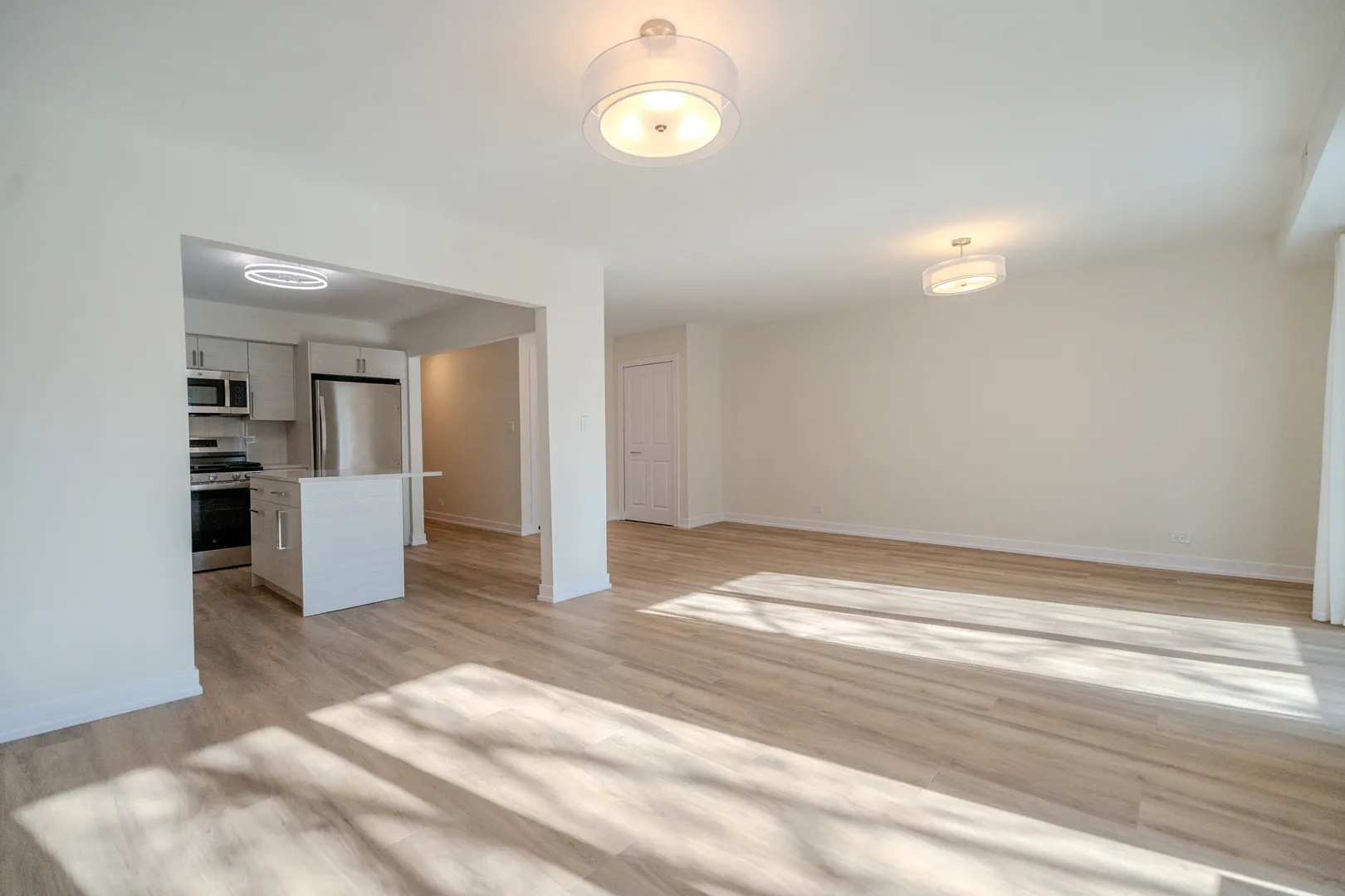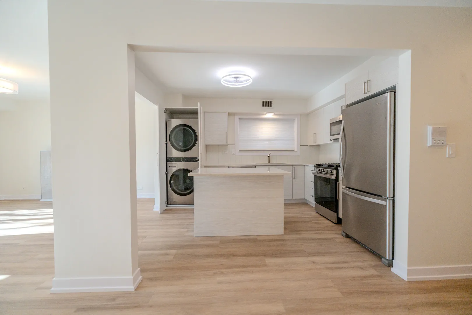 Welcome to this fully renovated 3-bedroom, 2-bath apartment offering over 1,000 square feet in a quiet Budlong Woods location, adjacent to Lincoln Square. This top-floor unit has been completely renovated and features brand new finishes throughout, including luxury vinyl flooring, a modern kitchen with quartz countertops, new cabinetry, stainless steel appliances, and new, contemporary bathrooms. The spacious layout includes a living level with a front balcony and southern exposures. The unit also offers good closet space with built-in racks, a private walk-in storage closet, and in-unit laundry. One assigned uncovered parking space is included. Rent includes water, sewer, and trash; tenant pays gas, electric, and cable/internet. Central heat and air conditioning. Walking distance to Swedish Covenant Hospital, Galter Center, parks, shopping, and transit, with the North Shore Channel Trail and River Park nearby.