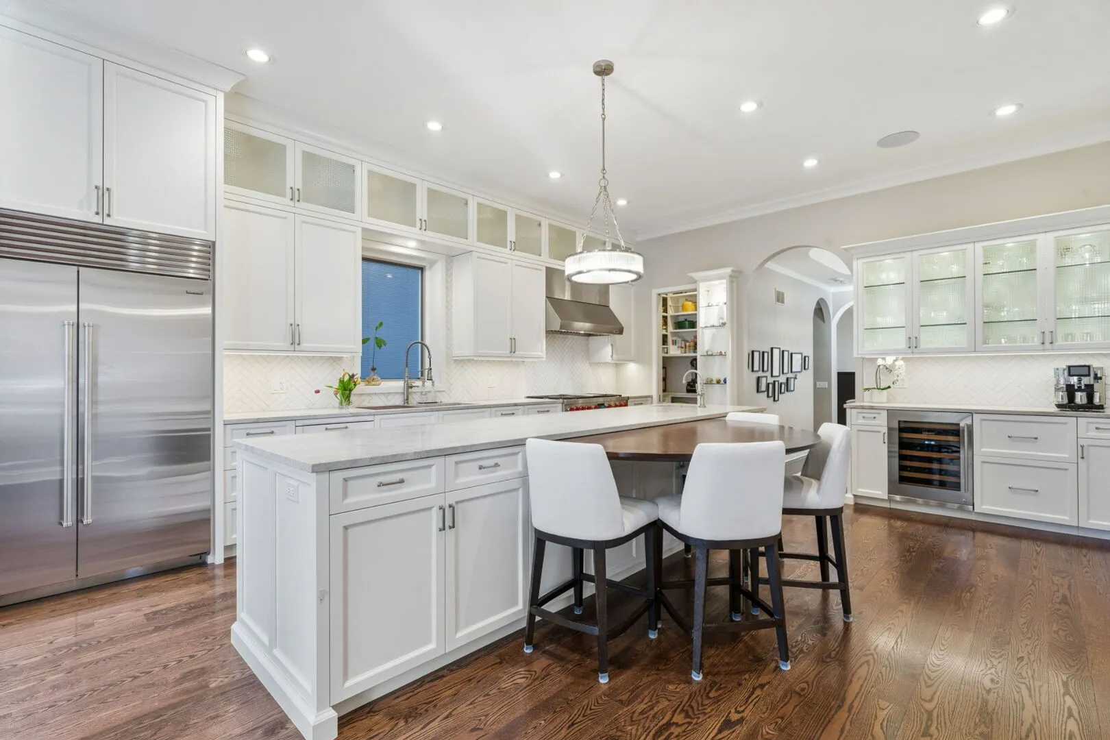 This exceptional 5-bedroom, 4-full and 1-half-bath residence offers over 5,000 square feet of meticulously updated living space across four expansive levels. Ideally situated on one of the most sought after blocks in prestigious East Lincoln Park. This home showcases refined architectural details and high-end finishes throughout, reflecting an uncompromising attention to detail. The fabulous gourmet kitchen features custom white cabinetry, quartzite countertops, 12ft island, warming drawer, counter seating and top-of-the-line appliances including Wolf, Sub-Zero, and Bosch. Beautifully designed walk-in pantry with custom cabinetry and quartzite countertop. The beverage/coffee bar includes wine fridge and refrigerator drawer. The kitchen opens to a cozy sitting area and flows seamlessly to a deck for grilling, which leads to a spectacular rooftop deck with pergola above the garage, perfect for outdoor enjoyment. The designer powder room with floating vanity and vessel sink is accented by a striking glass tiled feature wall. The sun filled living room with a quartzite stone fireplace, oversized arched windows, tray ceiling, crown molding, recessed lighting and rich hardwood floors adds elegance and sophistication. Gracious formal dining room is perfect for family gatherings. Second level offers 3 bedrooms, 2 full baths, and laundry closet. Luxurious primary suite with redesigned fireplace, spa bath with jetted soaking tub, oversized shower, double vanity, dual walk-in closets and a private deck. Spacious second bedroom features a fireplace and ensuite bath while the third bedroom shares a hall bath. Top level offers a versatile and impressive living space, including a large family room with skylights, wet bar, and a full wall of French doors opening to a private deck. A fourth bedroom or office with a full bath has two walls of rich wood bookcases with a rolling ladder leading to a private terrace with tree top and skyline views. Lower level offers a spacious recreation room with heated floors, fireplace, 5th bedroom, full bath, second laundry room, and an abundance of storage. Walk-out to private patio from the lower level family room. The homes 2.5-car garage is equipped with EV-ready 220 line. Incredible outdoor space throughout this home. Home improvements include New Roof (2021), 3 New HVAC systems (2022), Complete Kitchen Renovation (2022), New heated tile floor in family room (2022), Refurbished all hardwood floors (2022), Interior freshly painted (2022) and much more. See Additional Information on the MLS for more home improvements. Truly turnkey luxury in an unbeatable location near parks, shops, restaurants, lakefront, Lincoln Park Zoo and top-rated schools. A must see to appreciate all the incredible improvements this home has to offer.