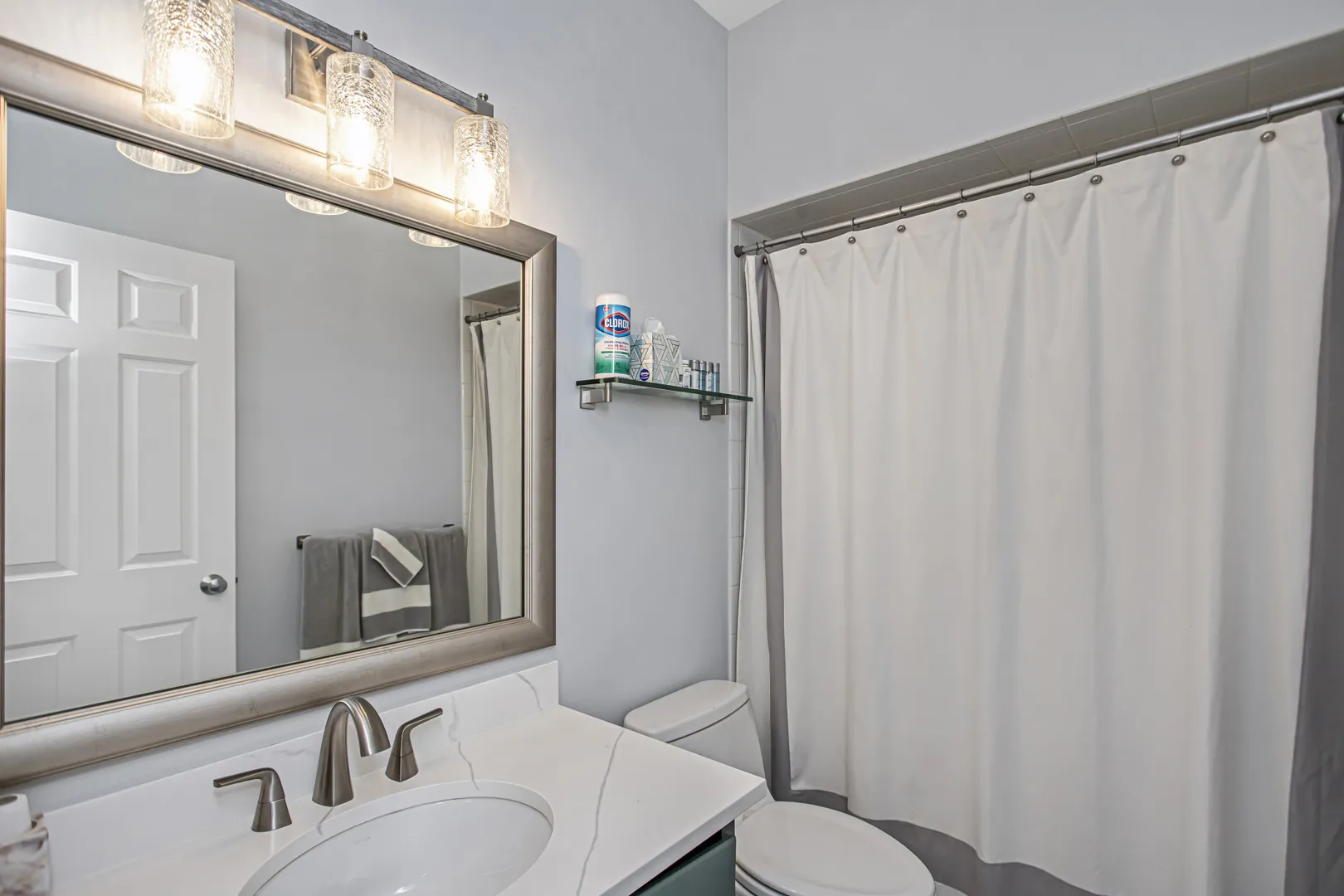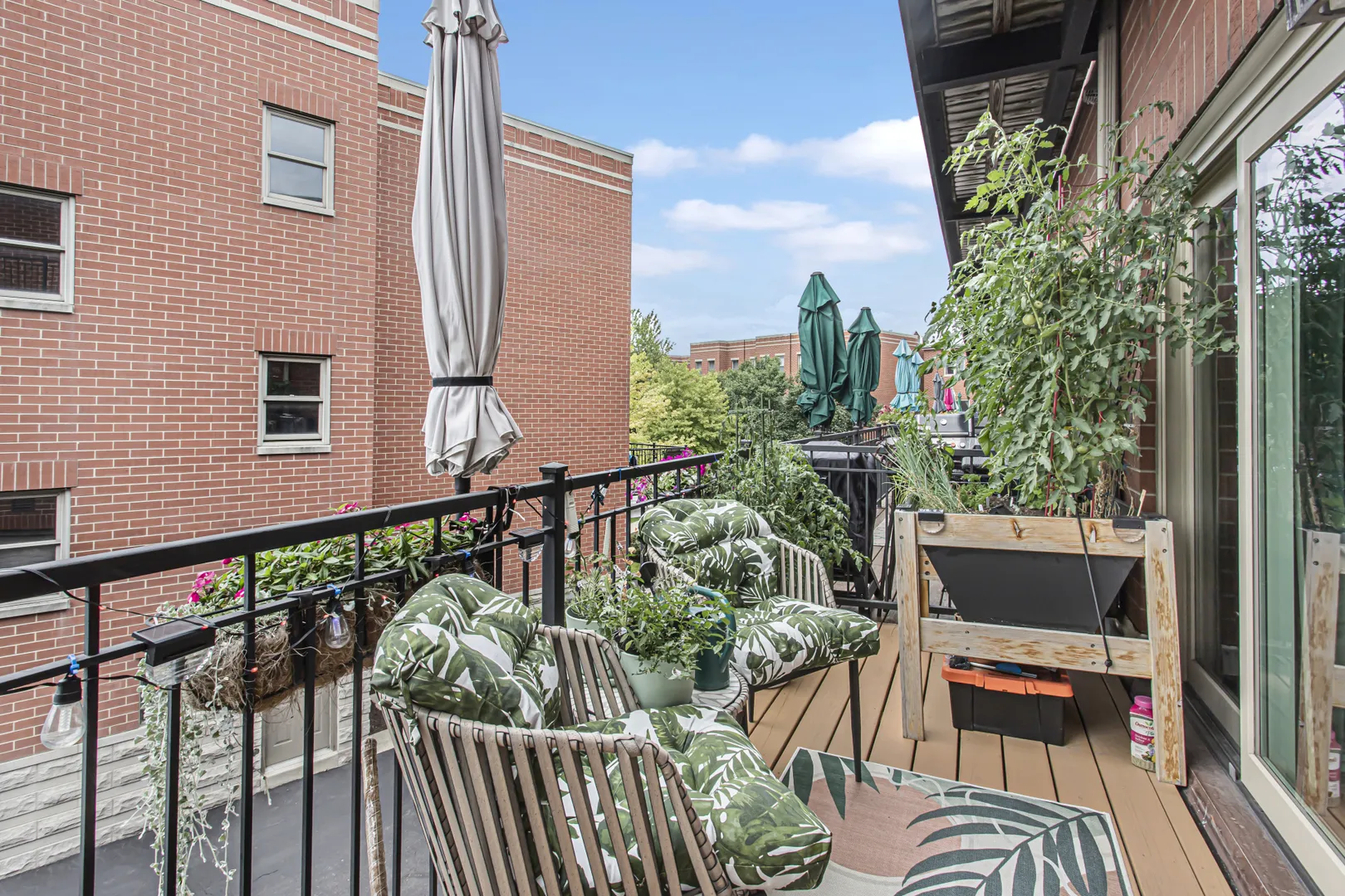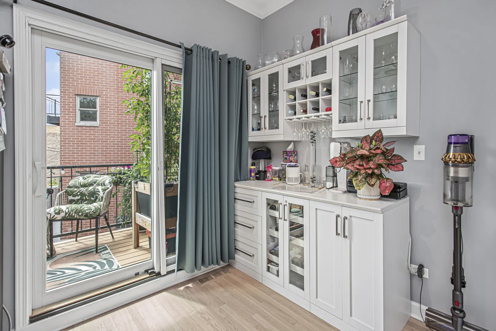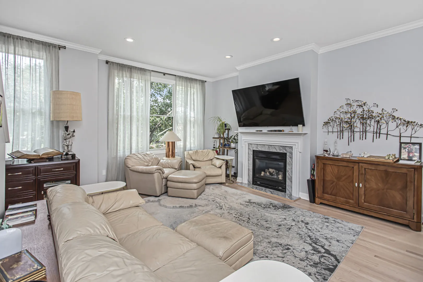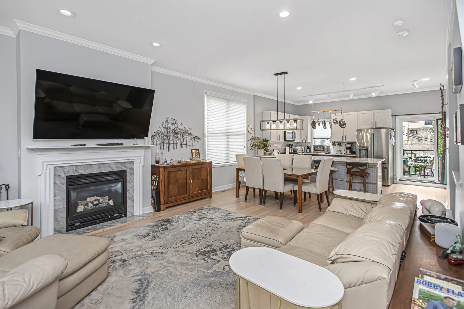 Sunny updated brick townhome with large open rooms and tall ceilings create a wonderful place to call home! The corner location allows for more windows with East, South and West exposure. This home has a large outdoor deck with sliding glass door just off the kitchen for convenient access. The updated kitchen has Quartz counters, GE Cafe appliances, full height backsplash and a custom buffet cabinet with wine storage and glass fronts. The living room has refinished hardwood floors, crown molding and a gas fireplace with mantel. The spacious primary bedroom has a walk-in closet, updated double vanity with quartz counter and Kohler fixtures. Both secondary bedrooms have in-suite baths. Pella windows, newer furnace, air conditioner, water heater and roof make this home move in ready and worry free. The front yard is gated with a covered patio and turf grass. The large 2-car garage is attached and is large enough for extra storage. This townhome community features a one of a kind beautiful courtyard to enjoy with friends and neighbors. Short walk to Blaine school, Southport retail and the Brown or Red line train.