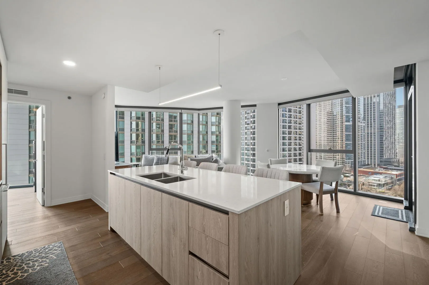 Residence 1401 at Cirrus Condominiums in Lakeshore East – A spacious and beautifully designed 2 bedroom, 2 bathroom corner unit in one of Chicago’s newest lakefront buildings. This exceptional home offers sweeping lake, city, and park views, featuring a split floor plan, private balcony, floor-to-ceiling windows, and wide-plank white oak flooring. The luxurious finishes include custom Snaidero cabinetry, Dornbracht fixtures, and quartz countertops with a decorative tile backsplash. The chef-caliber kitchen is equipped with a Gaggenau gas cooktop and oven, an integrated refrigerator, and a Bosch dishwasher. The well-proportioned primary bedroom features a large custom closet and a spa-like ensuite bath. The second bedroom is also generously sized, with a second full bath conveniently located nearby. Situated at the intersection of Lake Michigan and the Chicago River, Cirrus offers residents over 48,000 square feet of resort-style amenities, including the expansive new Cascade Park. The 41st-floor amenity level boasts a spectacular terrace for outdoor entertaining, complete with a lawn, fire pit, grilling stations, and rooftop seating. Additional outdoor highlights include a pool overlooking Lake Michigan. Indoor amenities include a chef’s table and demonstration kitchen, private dining room, wine lounge, and 24-hour concierge. Wellness-focused spaces feature an indoor lap pool with a hydrotherapy pool, a state-of-the-art fitness center, strength and motion studios, steam rooms, and a massage room. Residents can also enjoy the winter garden conservatory, a salon, a kids’ splash pad, and a sports simulator-all with breathtaking views of Lake Michigan, DuSable Harbor, and Navy Pier’s fireworks. For those who work from home, the building provides private offices, conference rooms, and multiple lounge areas. Cirrus is a pet-friendly community featuring an indoor dog run, pet spa, and an outdoor Bark Park. One indoor parking space and a storage locker are included! Can be rented furnished or unfurnished.