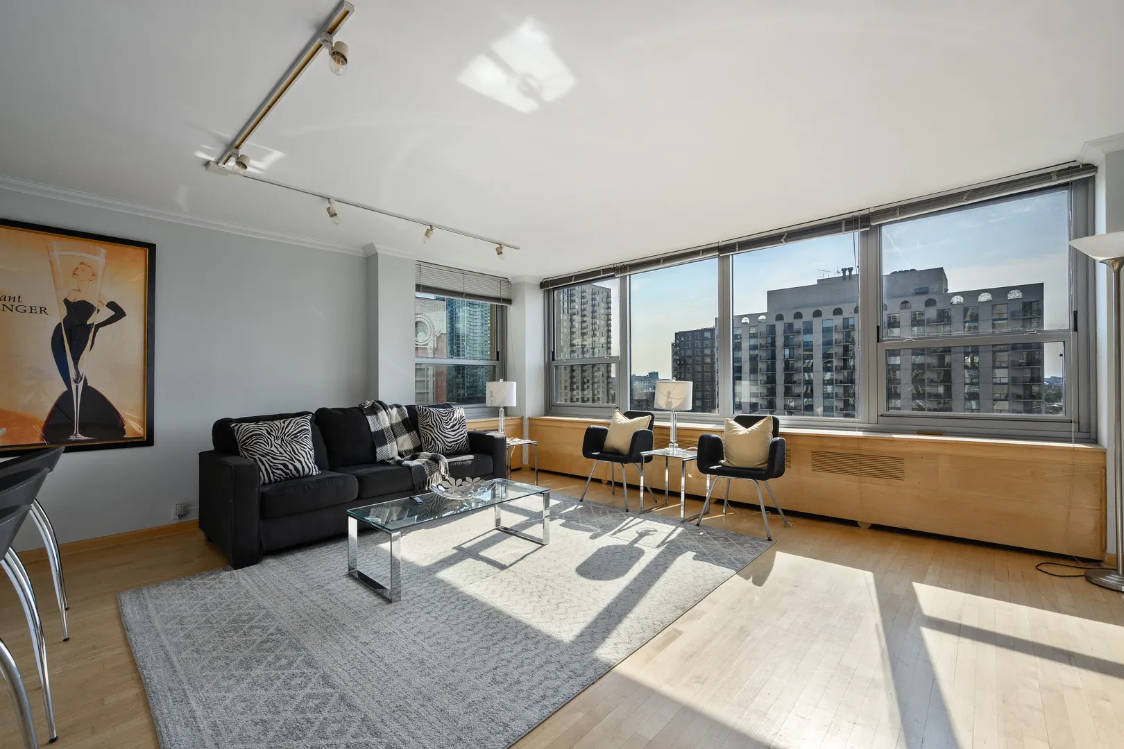 Completely furnished and move-in ready, this beautifully updated high-floor corner 1-bed, 1-bath home offers an open layout, abundant natural light, and lovely north and west views overlooking the pool. The modern white kitchen features stainless steel appliances, wine fridge, stone countertops, and breakfast bar, opening to a spacious living area with maple hardwood floors throughout. Generous closet space includes a walk-in closet, and the stylish bath offers great storage. Full-amenity building with 24-hour door staff, tennis courts, two outdoor pools, rooftop deck, outdoor lounge with gas grills, and underground access to FFC gym. New windows installed in 2018. Prime location near shopping, dining, nightlife, the lakefront, Old Town, and Oak Street and North Avenue beaches. Parking available via short waitlist. Rent includes heat, water, basic cable, and WiFi.