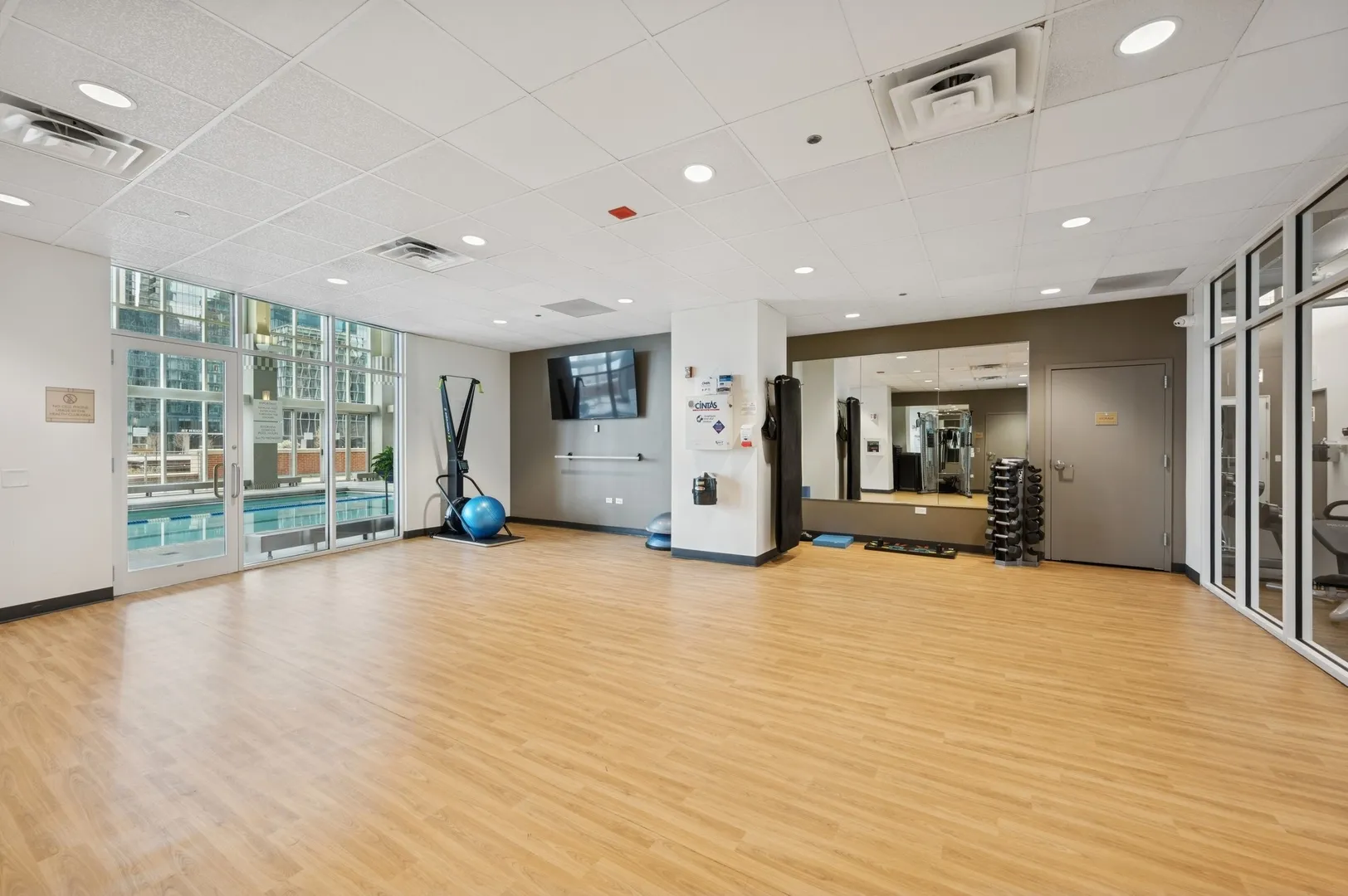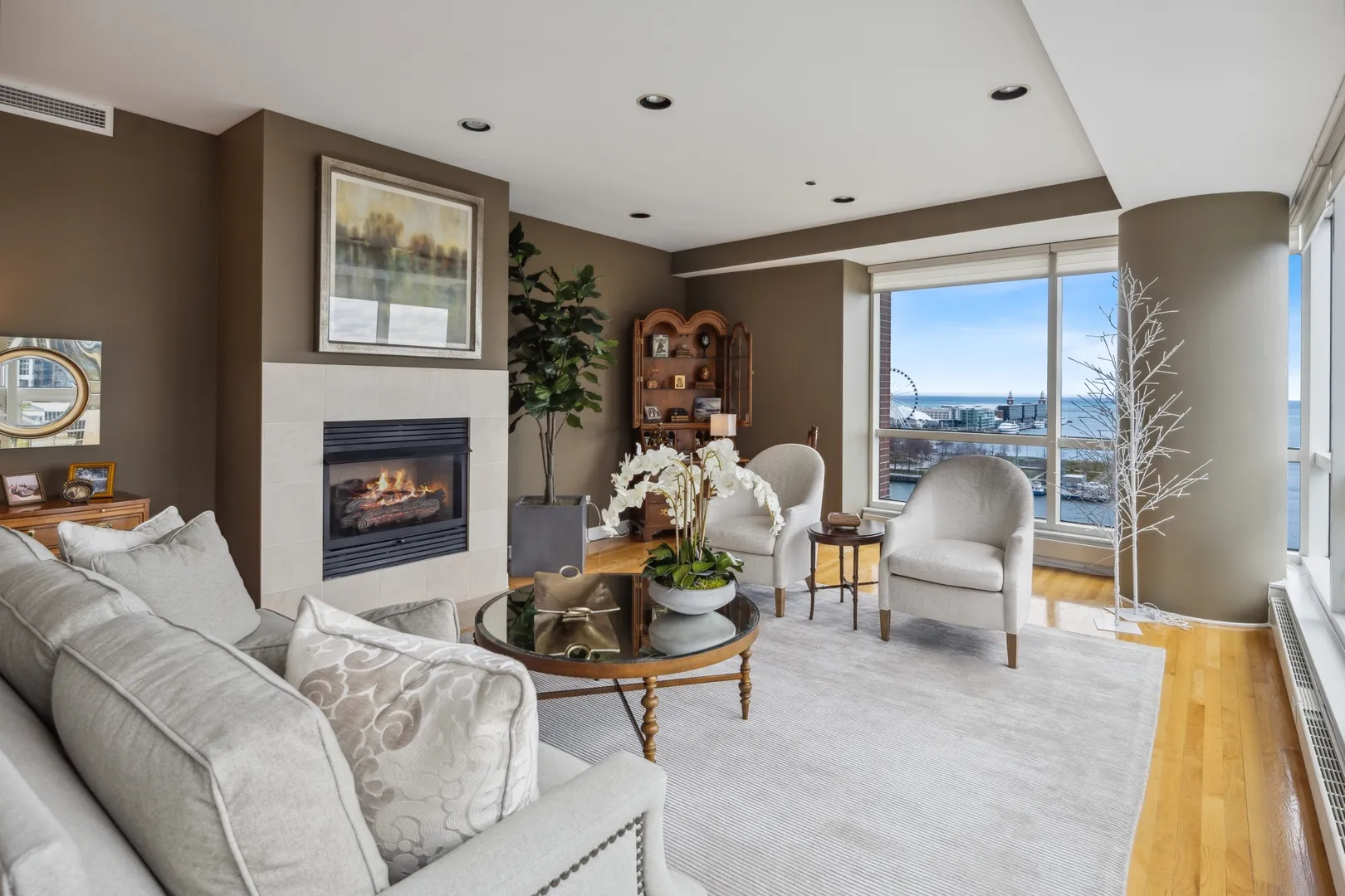 South- and east-facing 2,112 sq ft corner residence at Riverview Condominiums. This expansive two-bedroom home showcases stunning lake and river views, filling the space with abundant natural light throughout the day. The spacious living room is ideal for entertaining, featuring hardwood floors and a cozy fireplace-perfect for relaxing evenings. The large kitchen offers an abundance of cabinetry, a generous island, stainless steel appliances, and a Sub-Zero refrigerator. A dedicated dining area enhances the home’s open, comfortable flow. Both bedrooms are situated on the east side of the residence. The primary suite features a wall of windows, hardwood floors, and a walk-in closet. The primary bath includes double vanities, a spacious walk-in shower, and a dedicated vanity/makeup area. The second bedroom provides excellent flexibility as a guest room, home office, or den. A separate laundry room with side-by-side washer and dryer and additional storage adds everyday convenience. One parking space is included. Residents enjoy a professionally managed building with 24-hour door staff, a fully equipped fitness center, hospitality room with catering kitchen, indoor pool with sundeck and outdoor lounge, car wash station, and package delivery services. Available for move-in June 15, 2026.